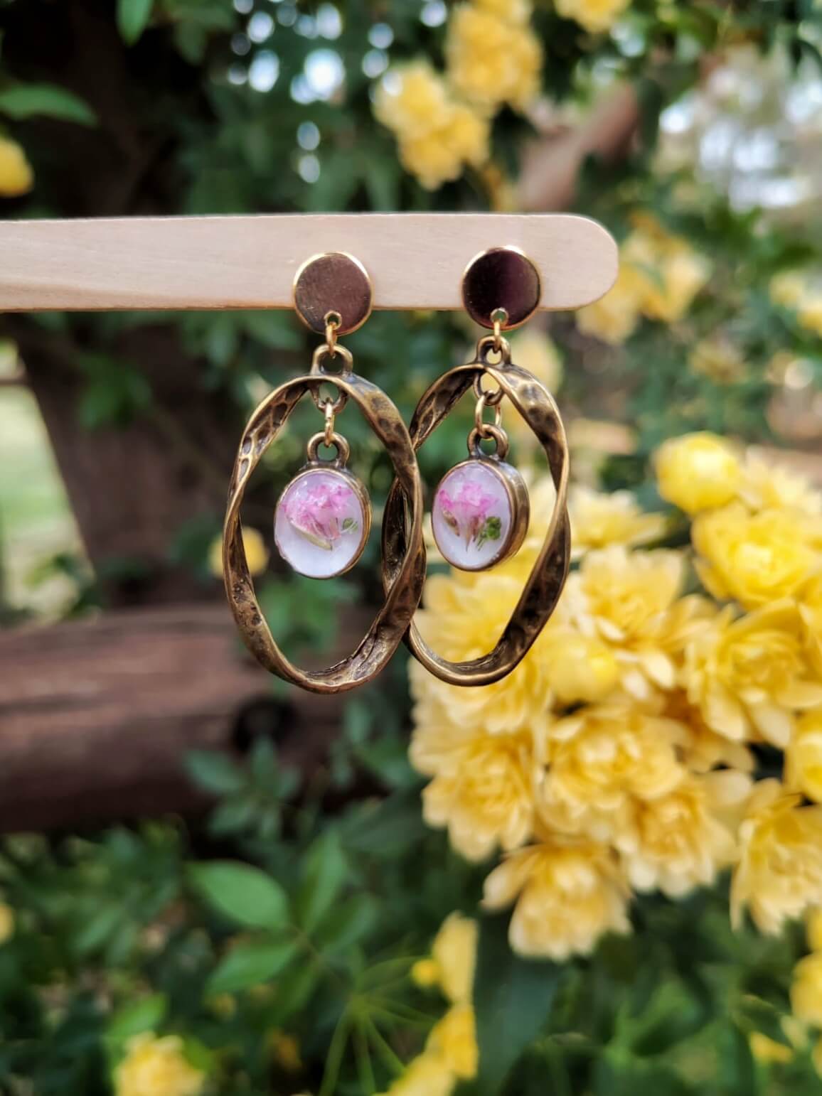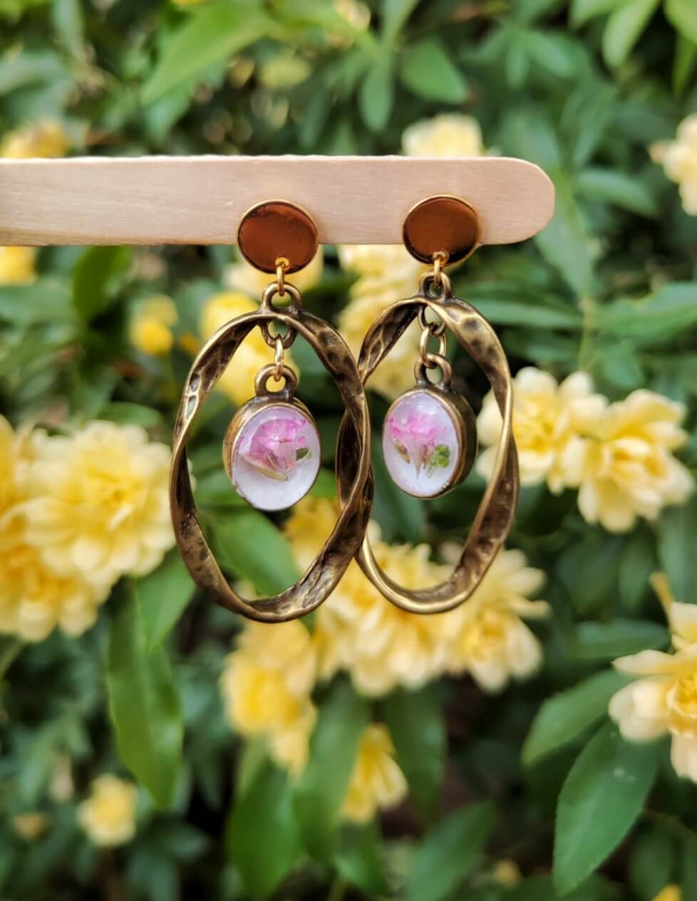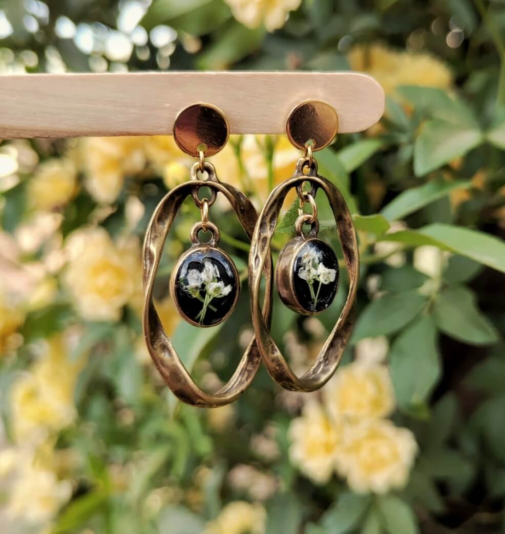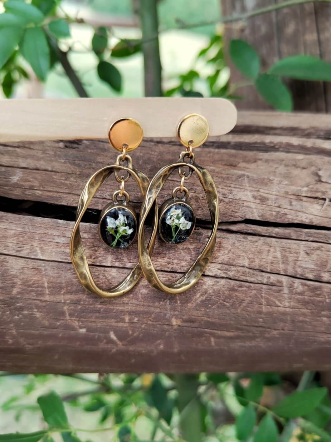 Material: Arete acero inoxidable. Forma Ovalada martillada conectado con el bisel ovalado bronze antiguo chapado, relleno de resina UV y flores naturales.