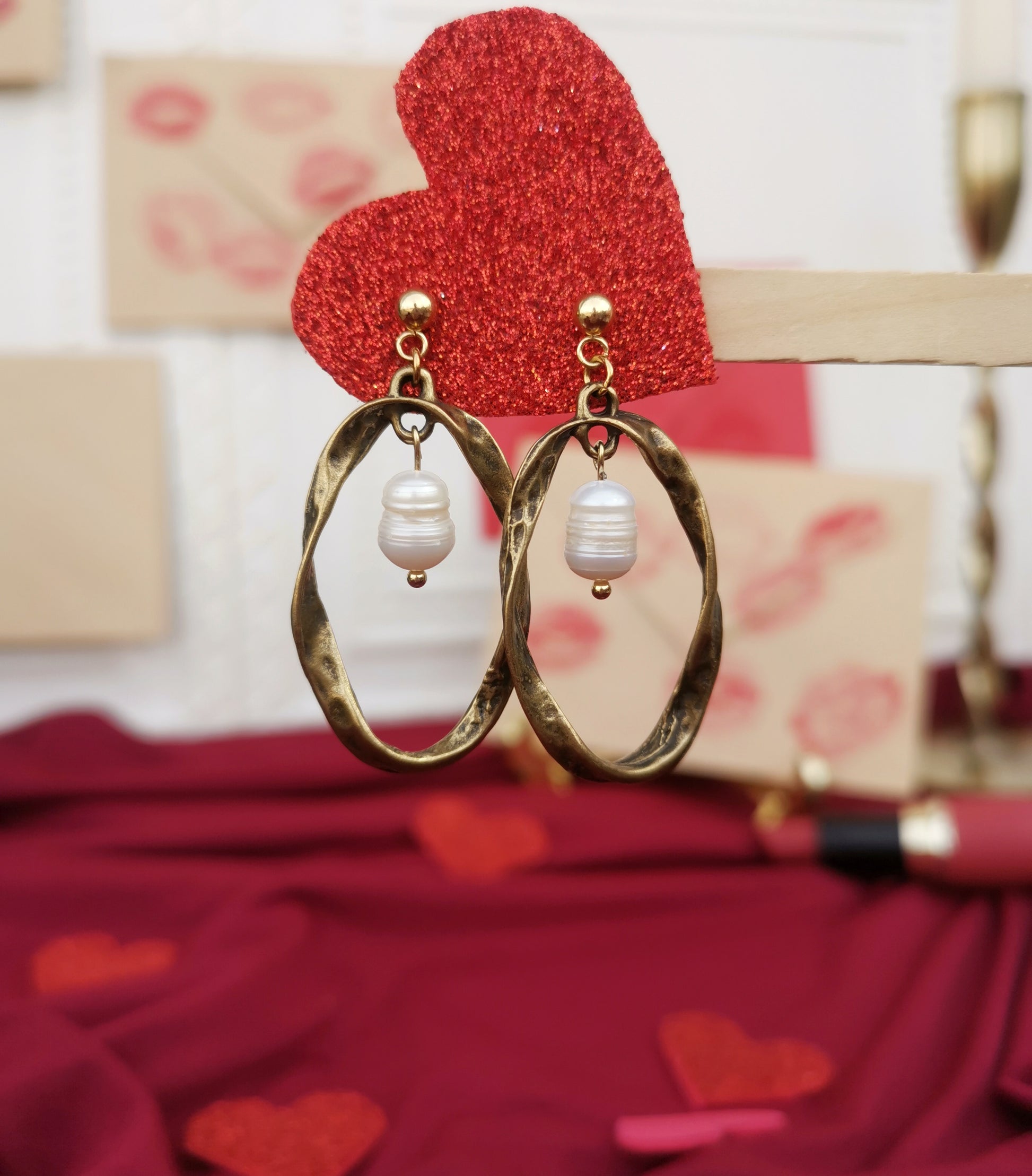 Material: Arete acero inoxidable. Forma Ovalada martillada conectado con perla de rio.