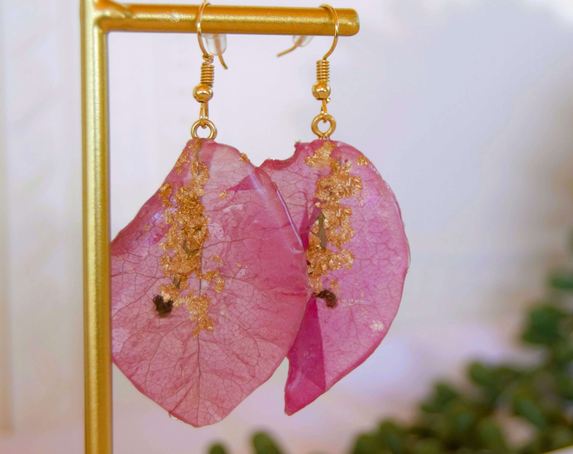 Aretes de acero inoxidable. Bugambilla encapsulada con Resina UV, y hojas de oro.
