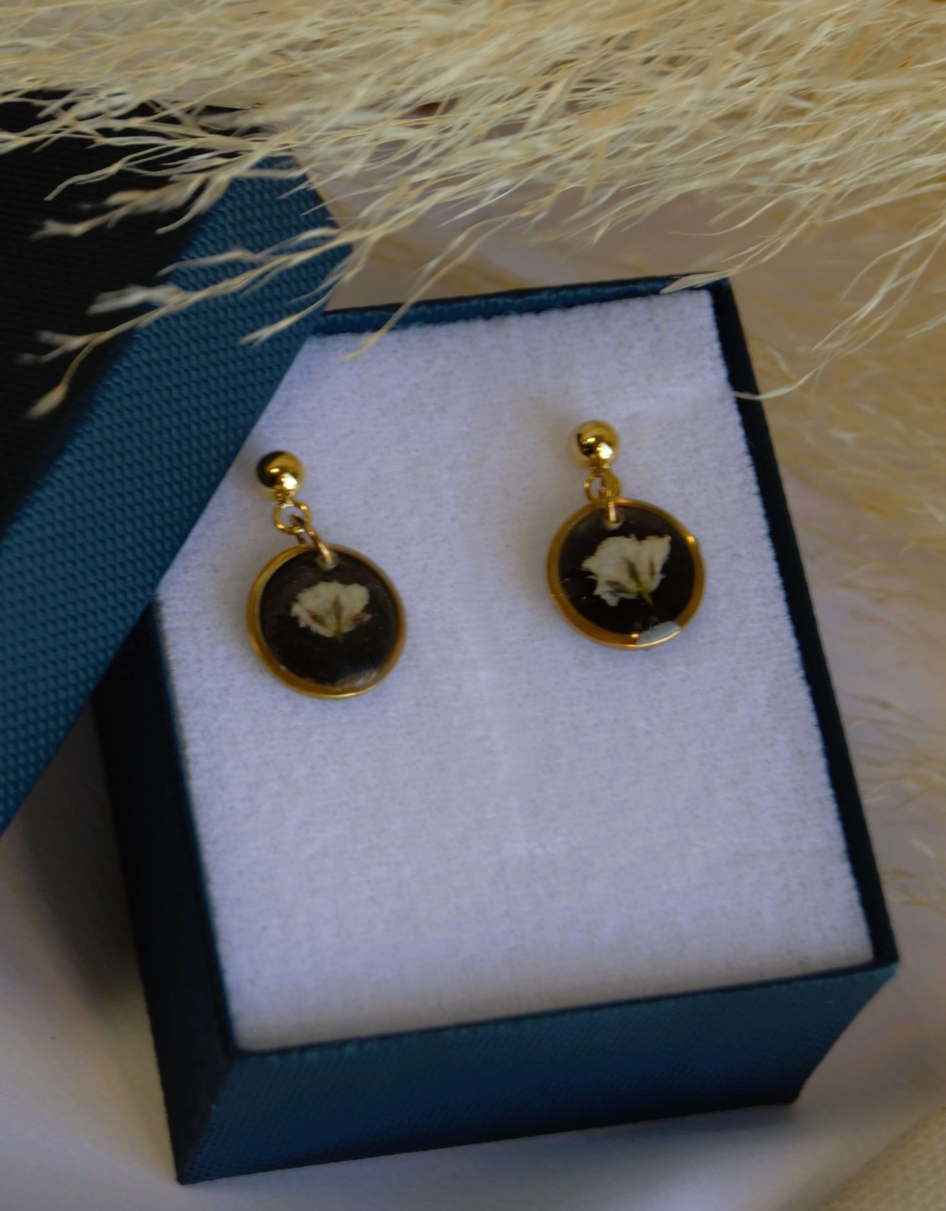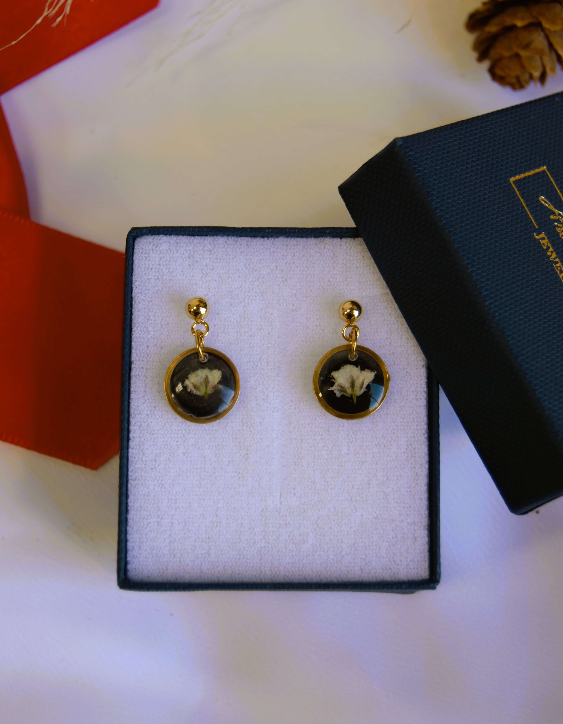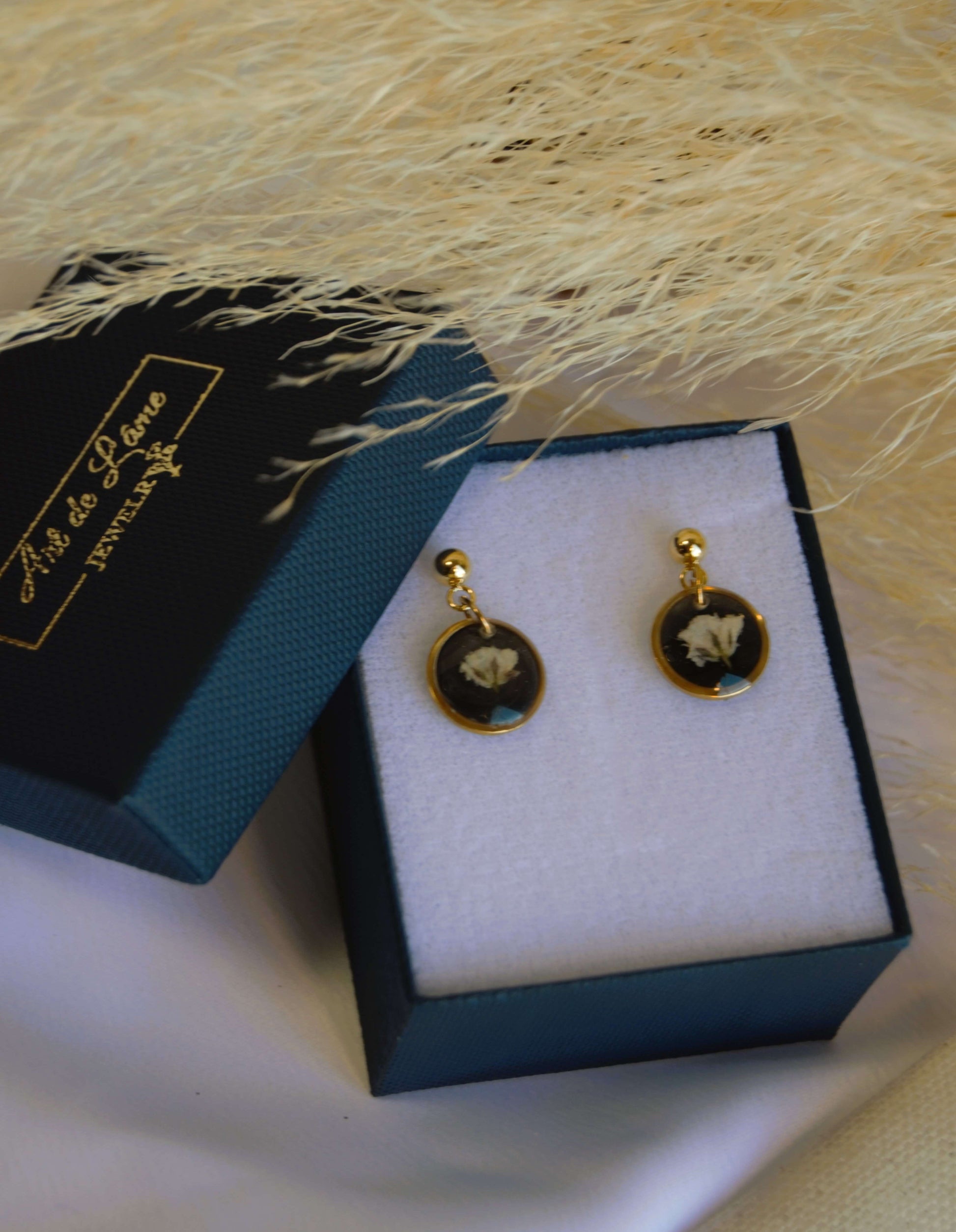 Estos aretes son la versión negra de los aretes Ava. Al igual son una hermosa adición a cualquier conjunto. Hechos con flores naturales. ¡Luce sofisticada y a la moda con estos aretes. Son de acero inoxidable rellenos de resina UV color negro y una flor gysophilia blanca natural secada . Su tamaño es de 1.8 cm largo y 1.3 ancho.