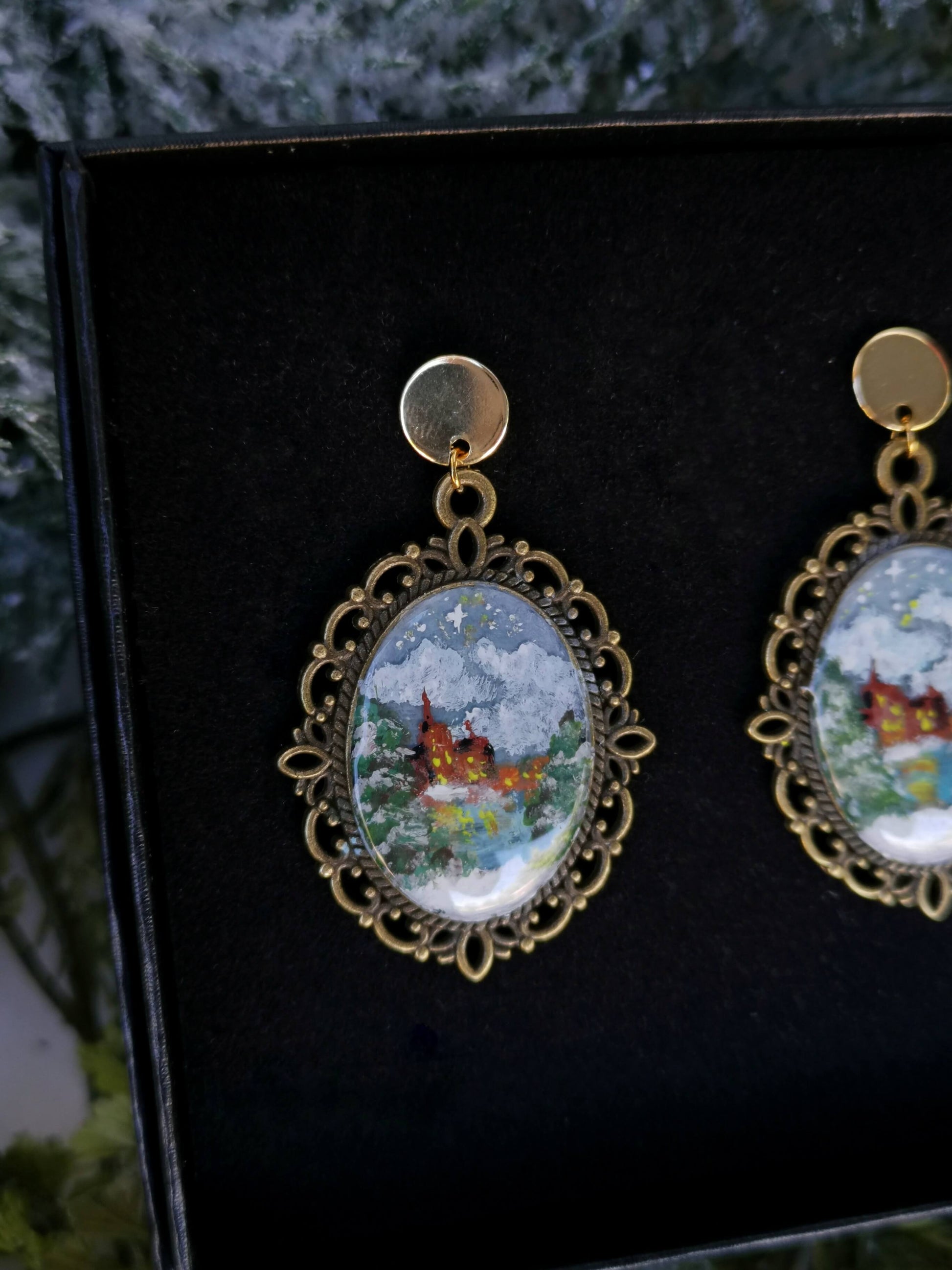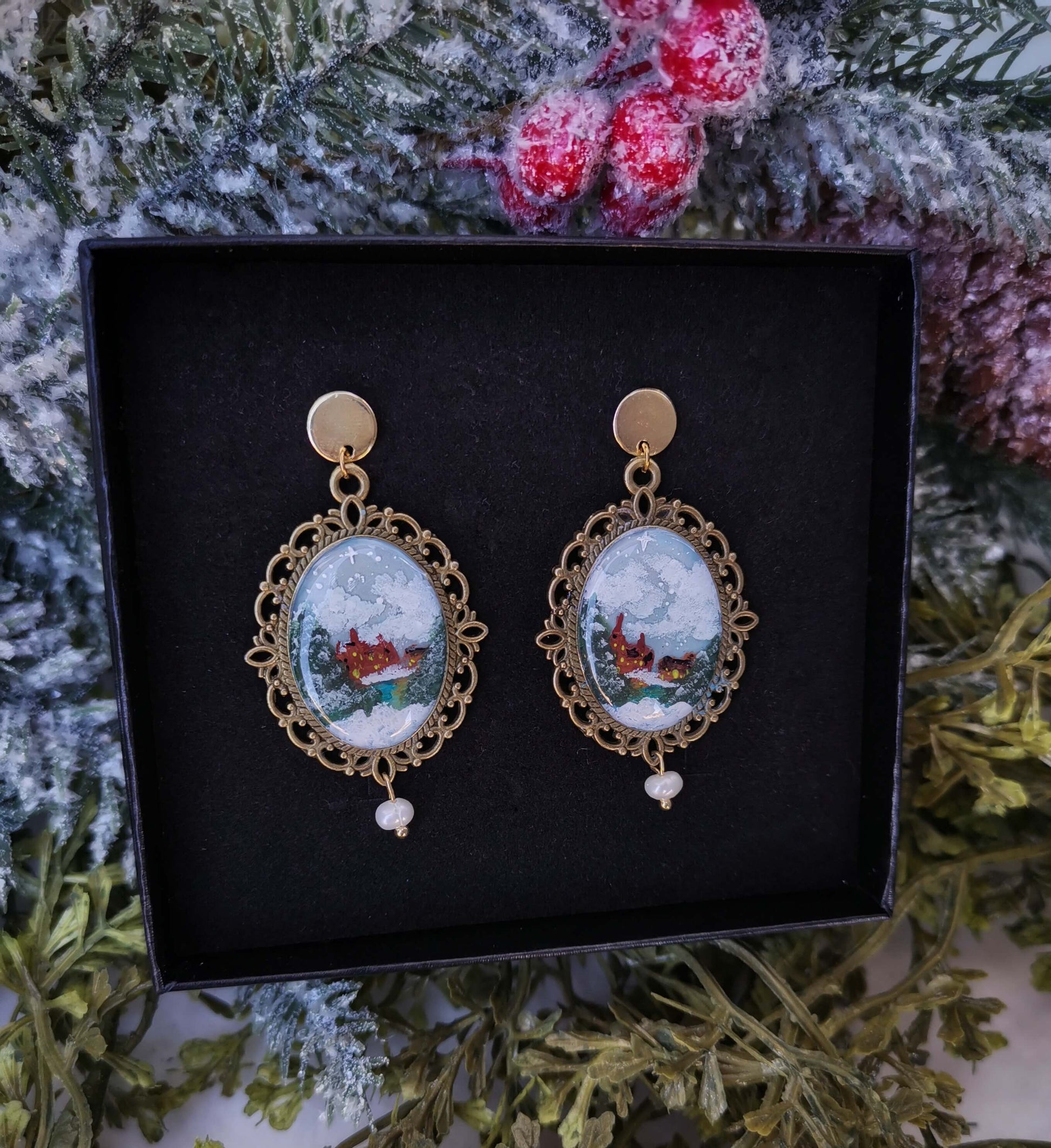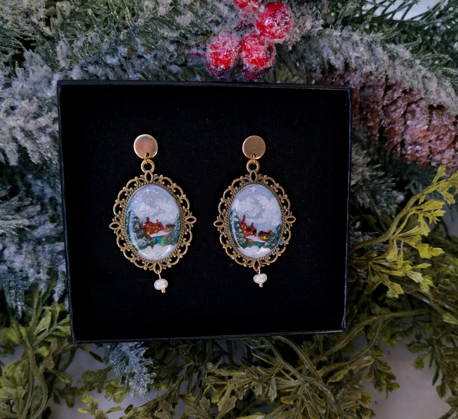 Aretes que capturan la magia invernal. Un accesorio único que combina arte y elegancia. Ideales para quienes aprecian la joyería personalizada y desean llevar consigo una obra de arte wearable. Perfectos como regalo especial o para complementar tu estilo con un toque sofisticado y narrativo.