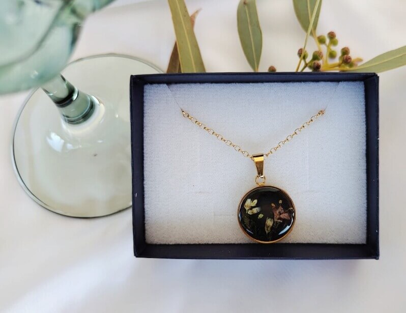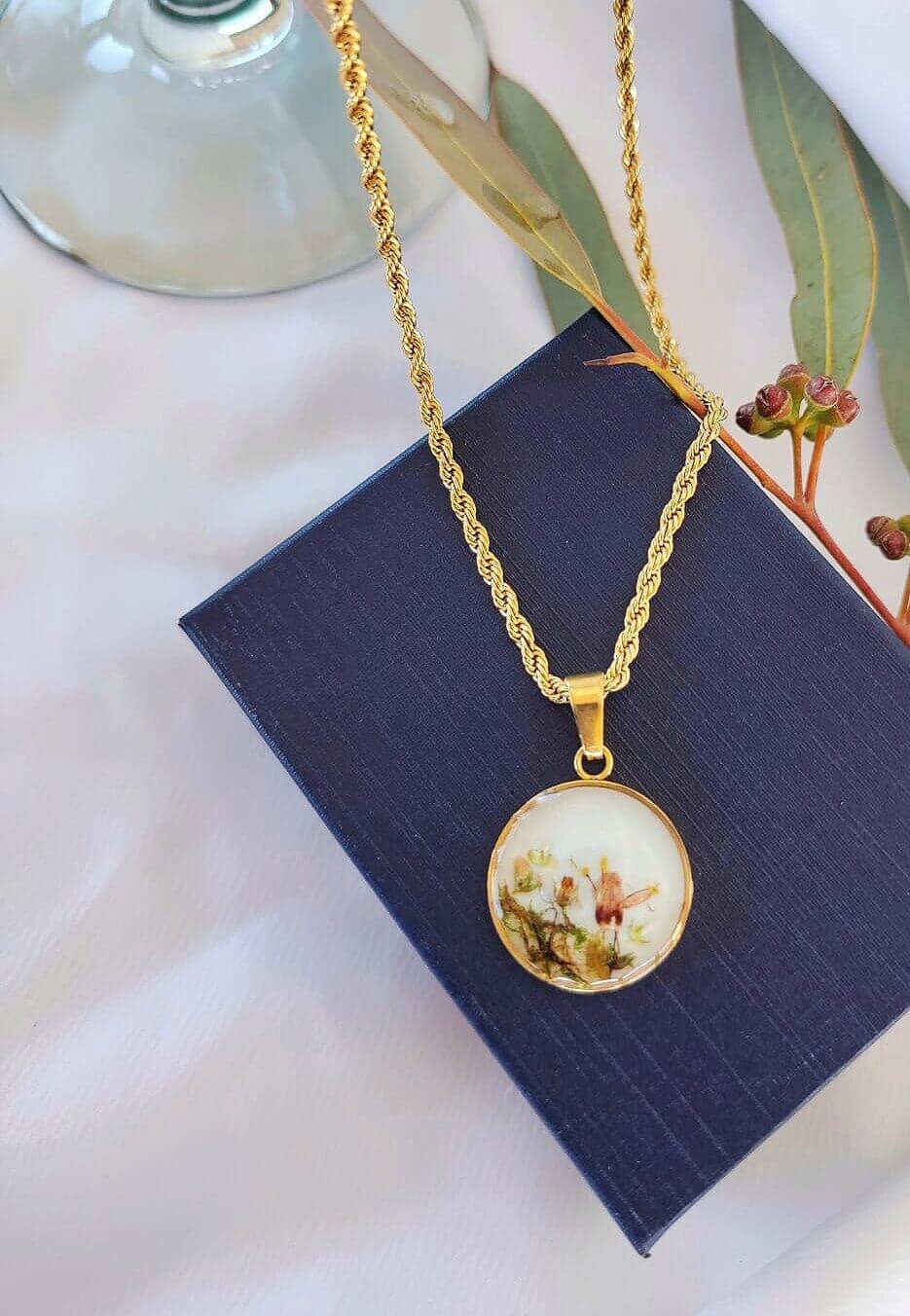 La cadena es de acero inoxidable tipo Torzal, 2 mm de grueso y de 41 cm de largo y con extensión de cadena. El bisel redondo es de 2 cm el díametro relleno de resina Uv y con un diseño con flores naturales secadas diferentes.