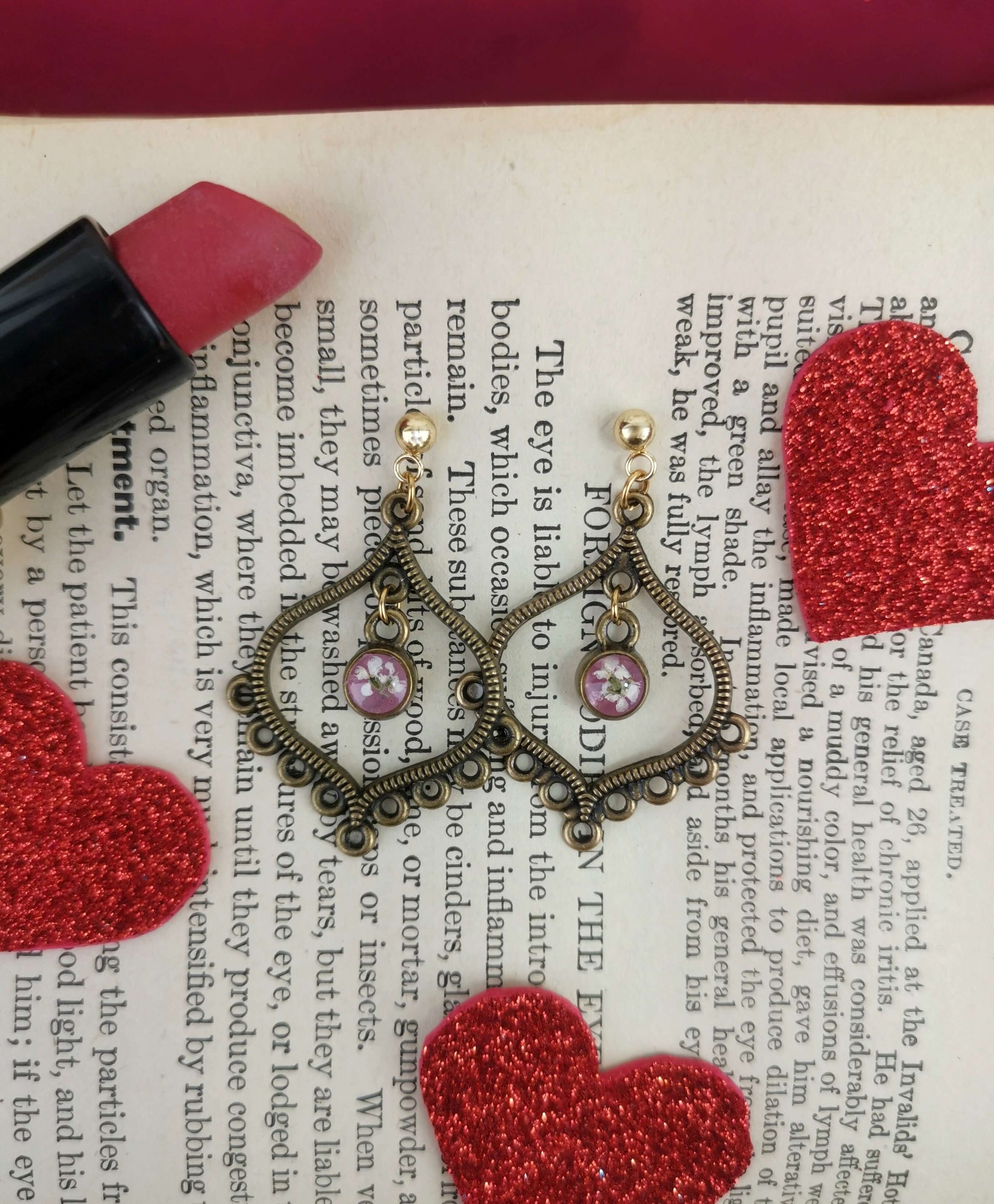 Material: Arete acero inoxidable. Bisel bronze antiguo chapado, relleno con resina UV y flores natruales secadas.