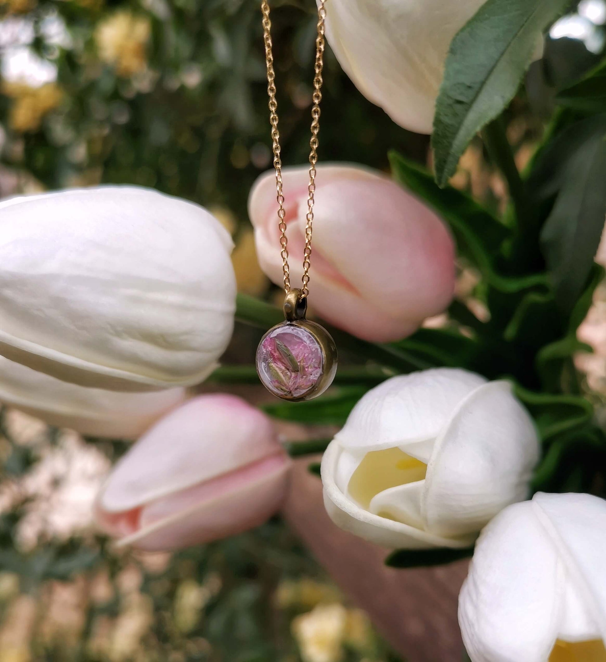Collar con colores de primavera y flores, perfecto para dar un toque delicado y elegante a cualquier atuendo. Su diseño simple lo hace ideal para combinar con cualquier estilo y su belleza lo hace único. ¡Una opción imprescindible para esta temporada!