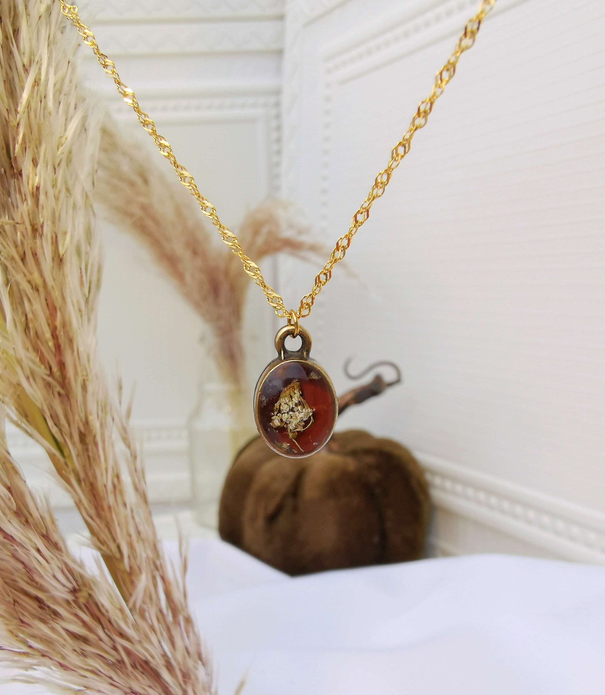 Cadena twisted es de Acero inoxidable dorado. Bisel bronze antiguo chapado. Relleno de resina uv y flores naturales encapsuladas.