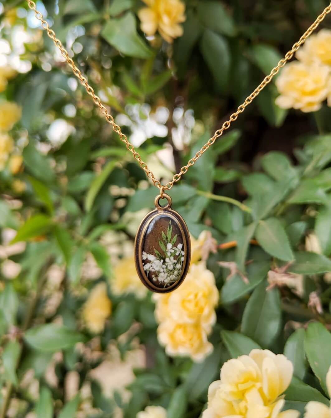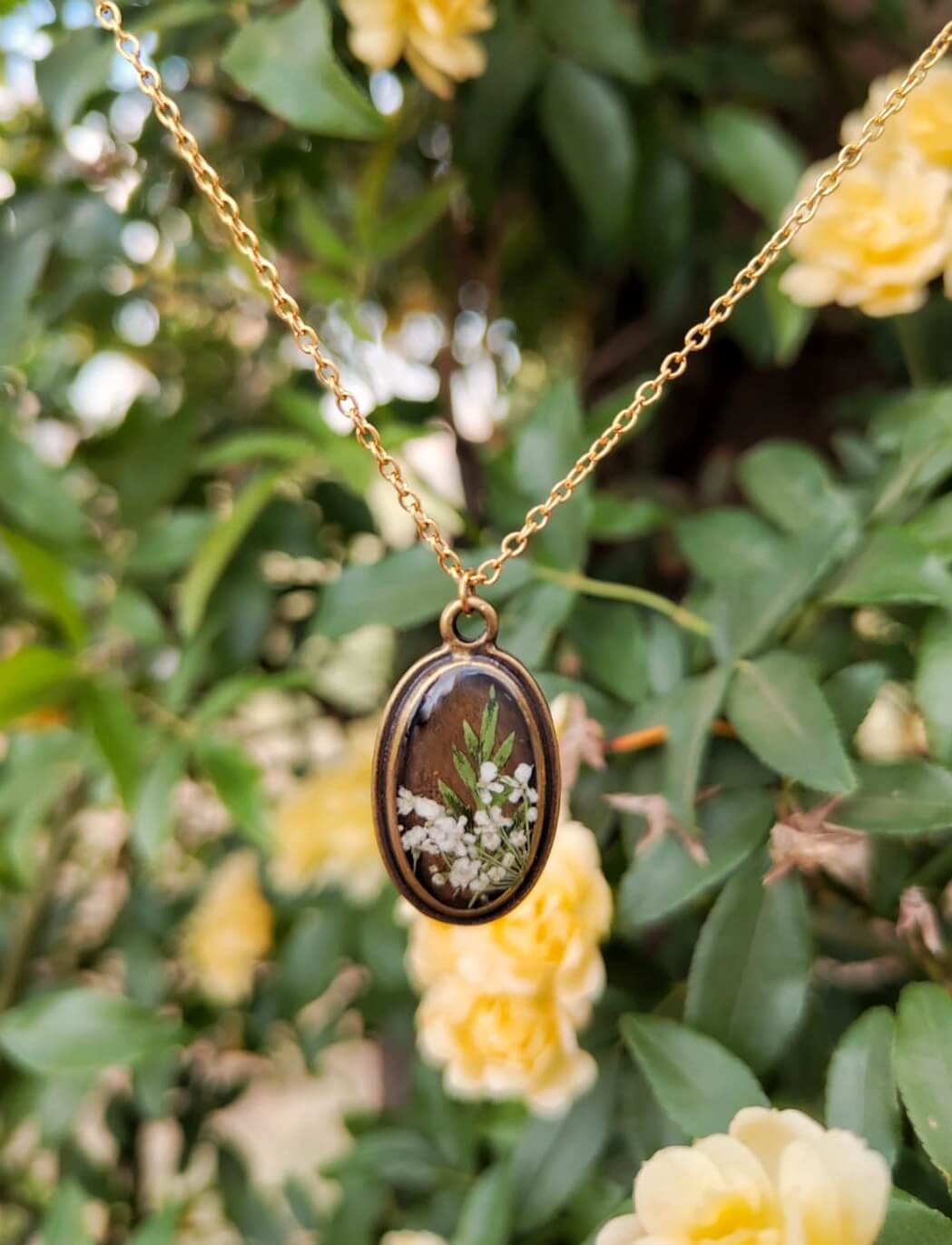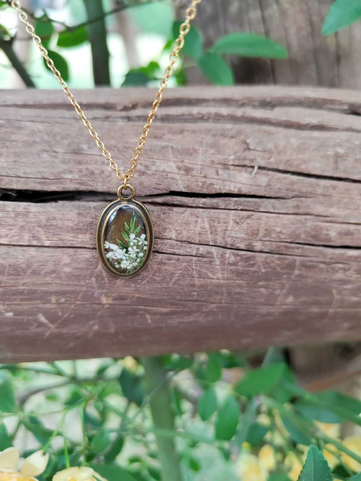 Material: Cadena acero inoxidable. Bisel ovalado bronze antiguo chapado, relleno con resina UV, y flores naturales secadas.