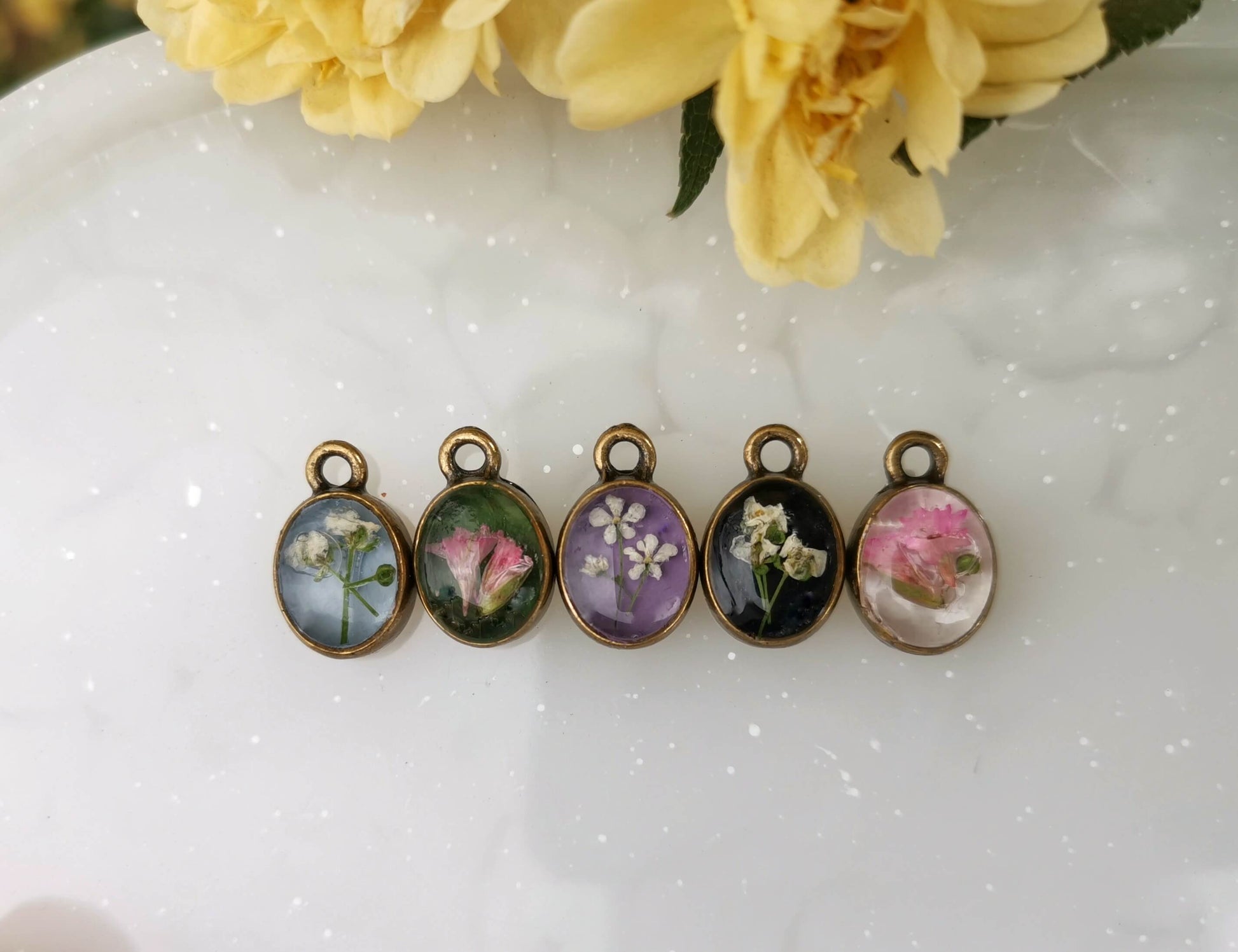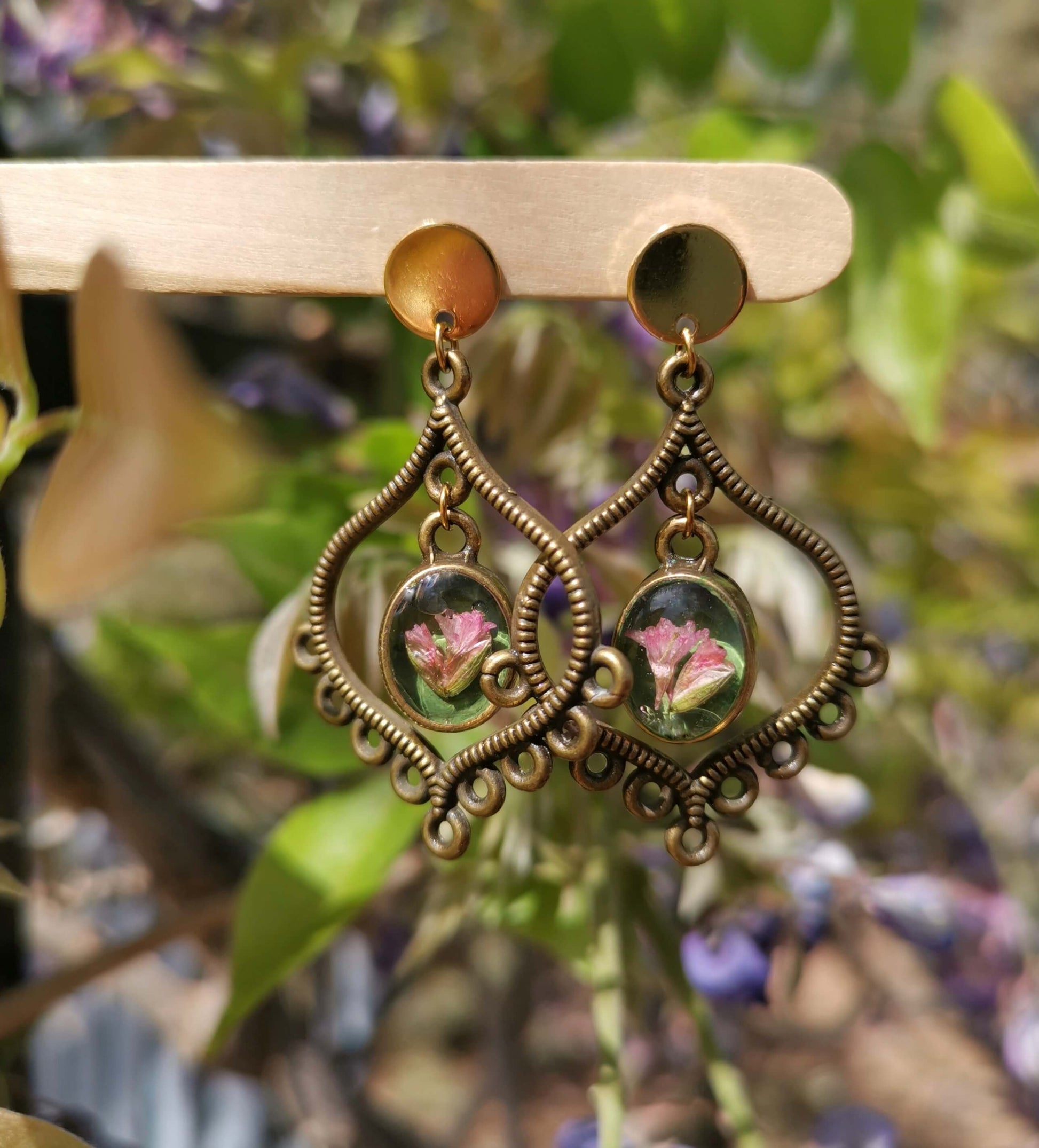 Material: Arete acero inoxidable. Bisel bronze antiguo chapado, relleno con resina UV y flores natruales secadas.