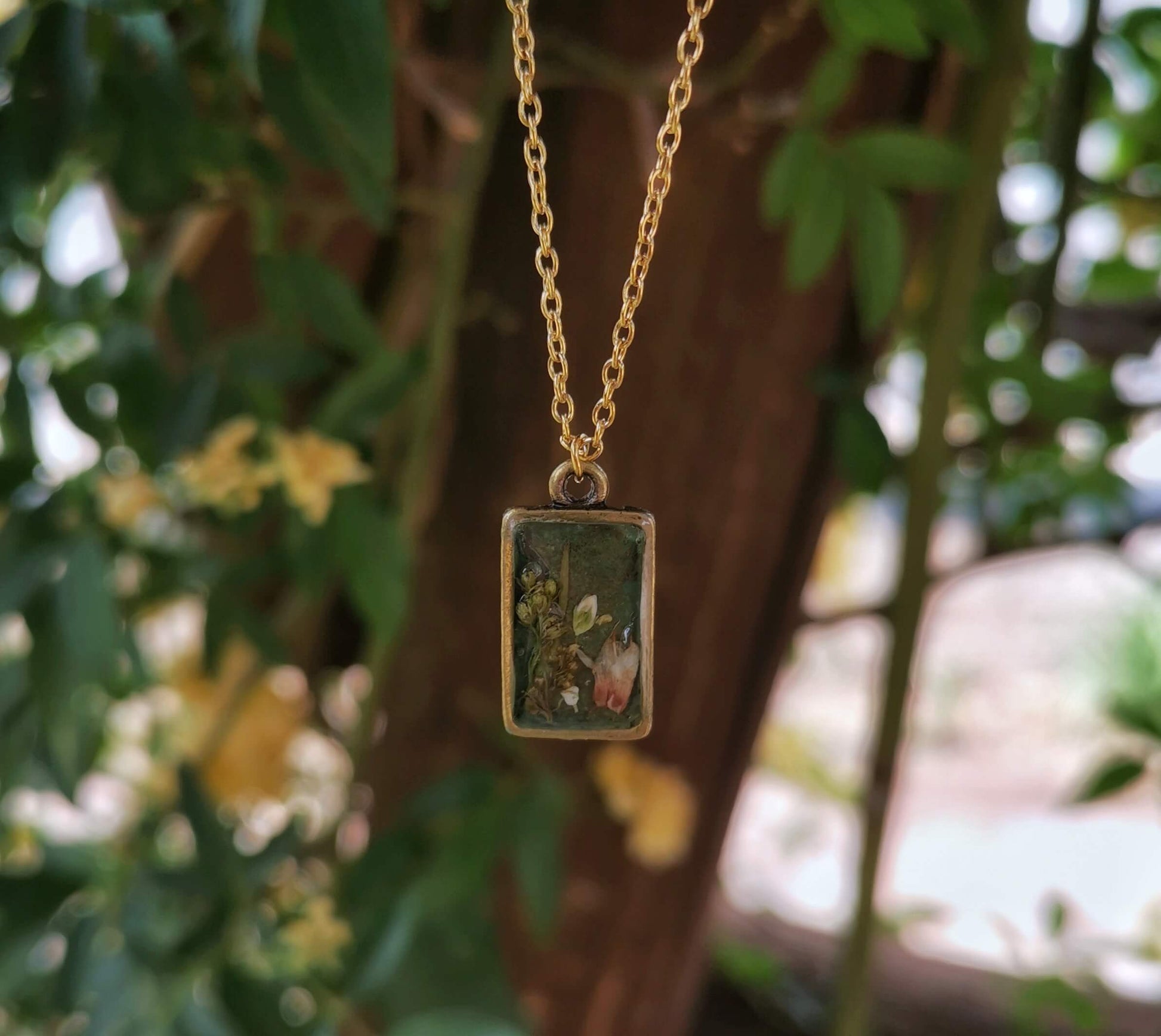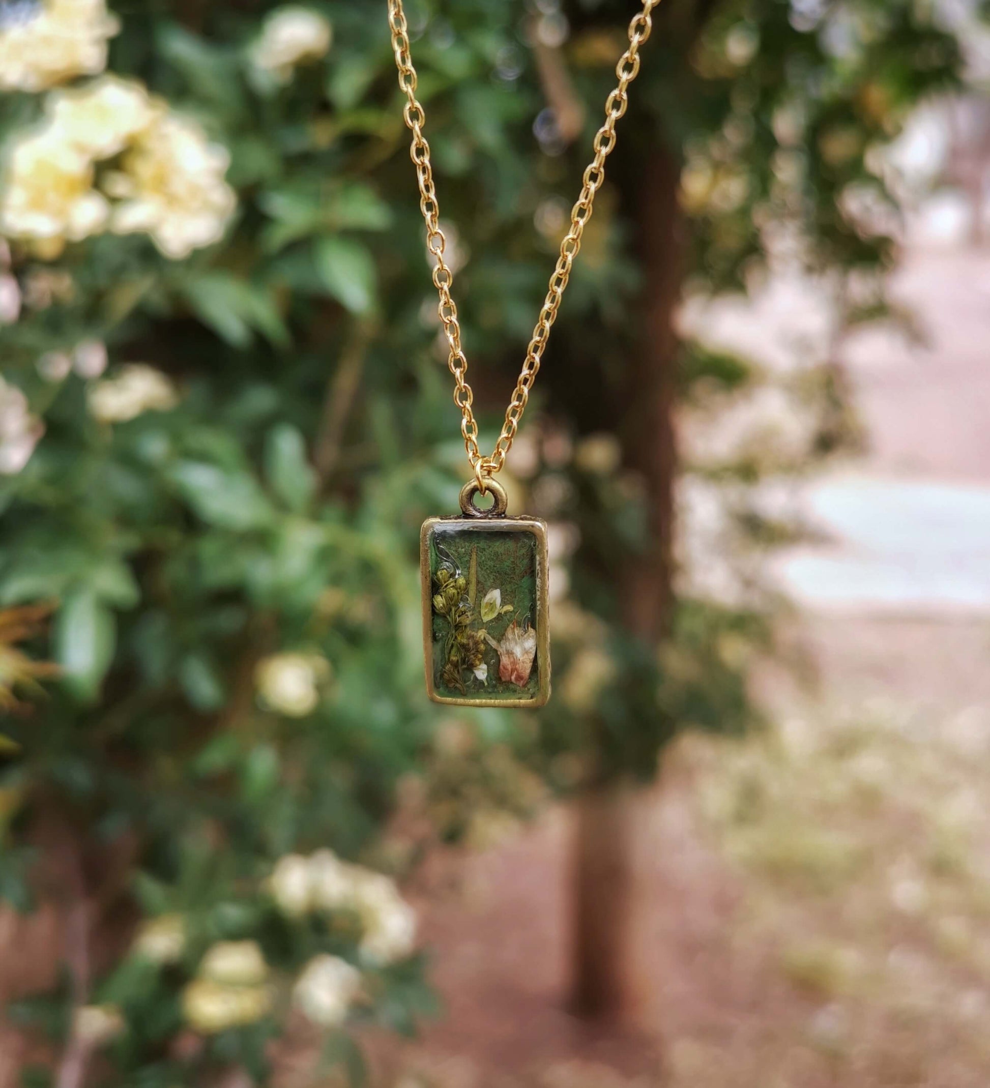Material: cadena acero inoxidable, bisel rectangular, mosaico por atras, bronce antiguo chapado, relleno con resina UV y un diseño con flores naturales.