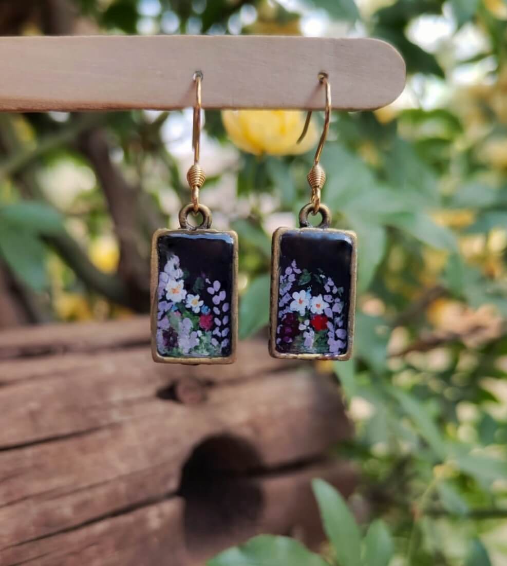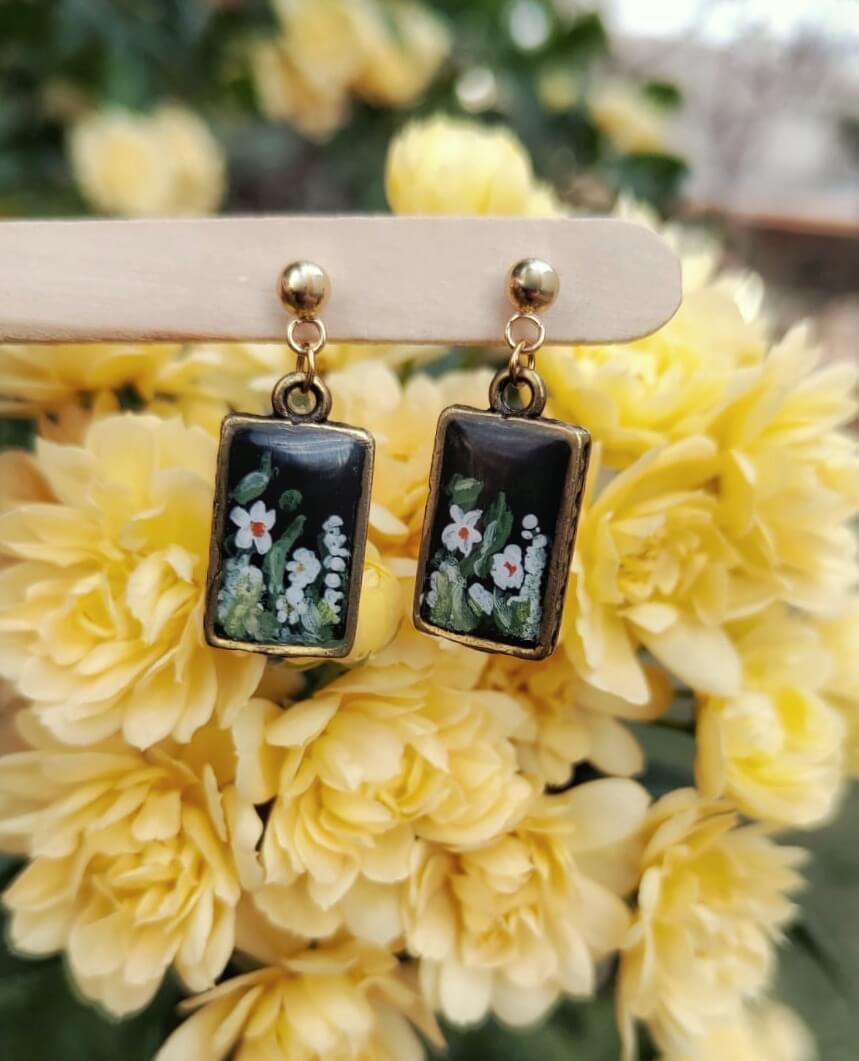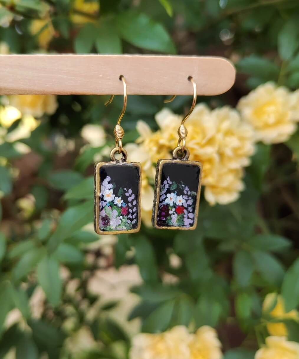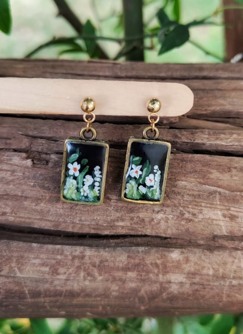 Material: Arete acero inoxidable. Bisel rectangular bronze antiguo chapado, pintado a mano flores, relleno con resina UV.