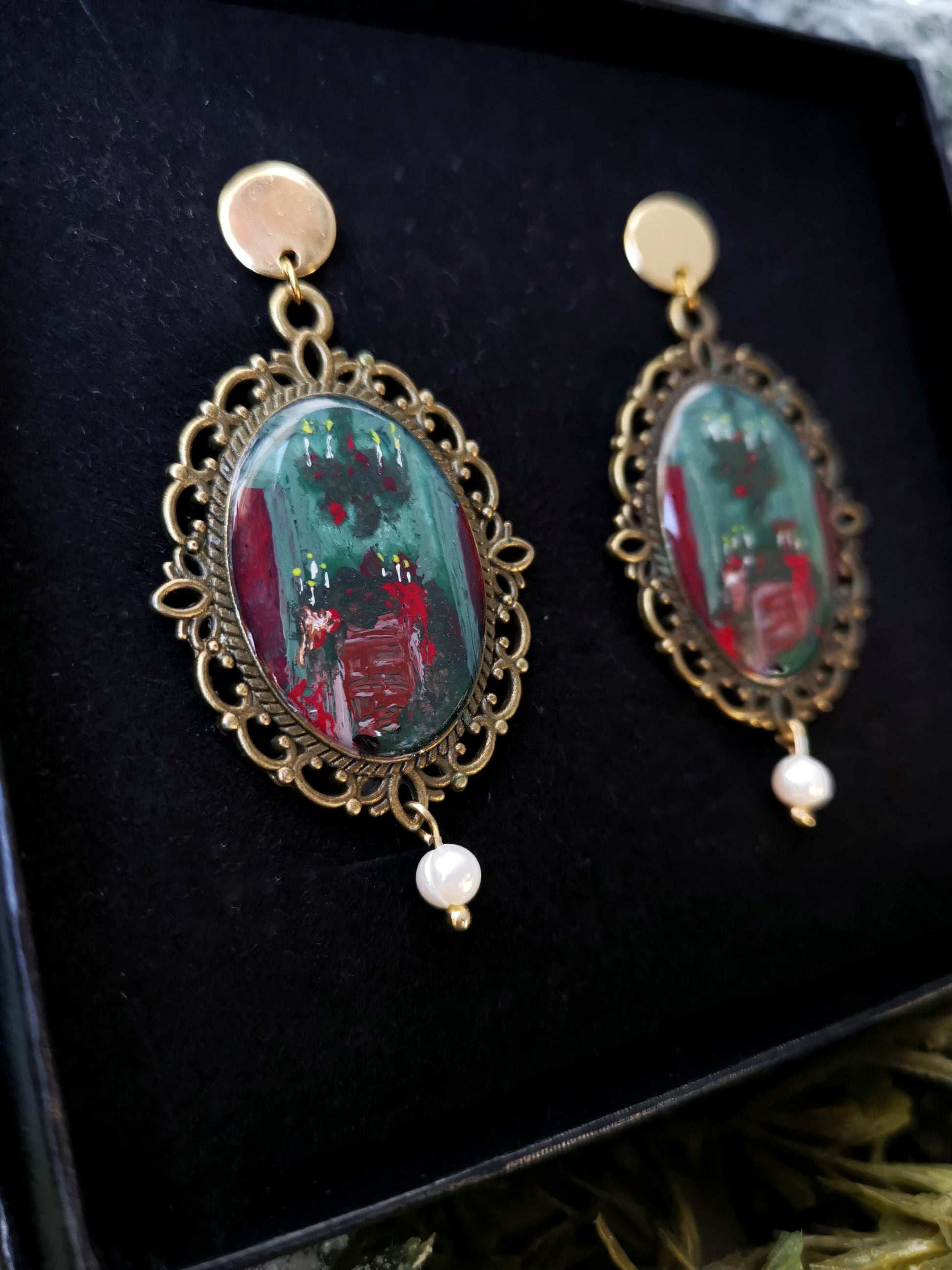 Acero inoxidable, resina UV transparente, pintado con acrílico. Con perla natural de Rio o sin perla. Bisel bronze antiguo chapado.