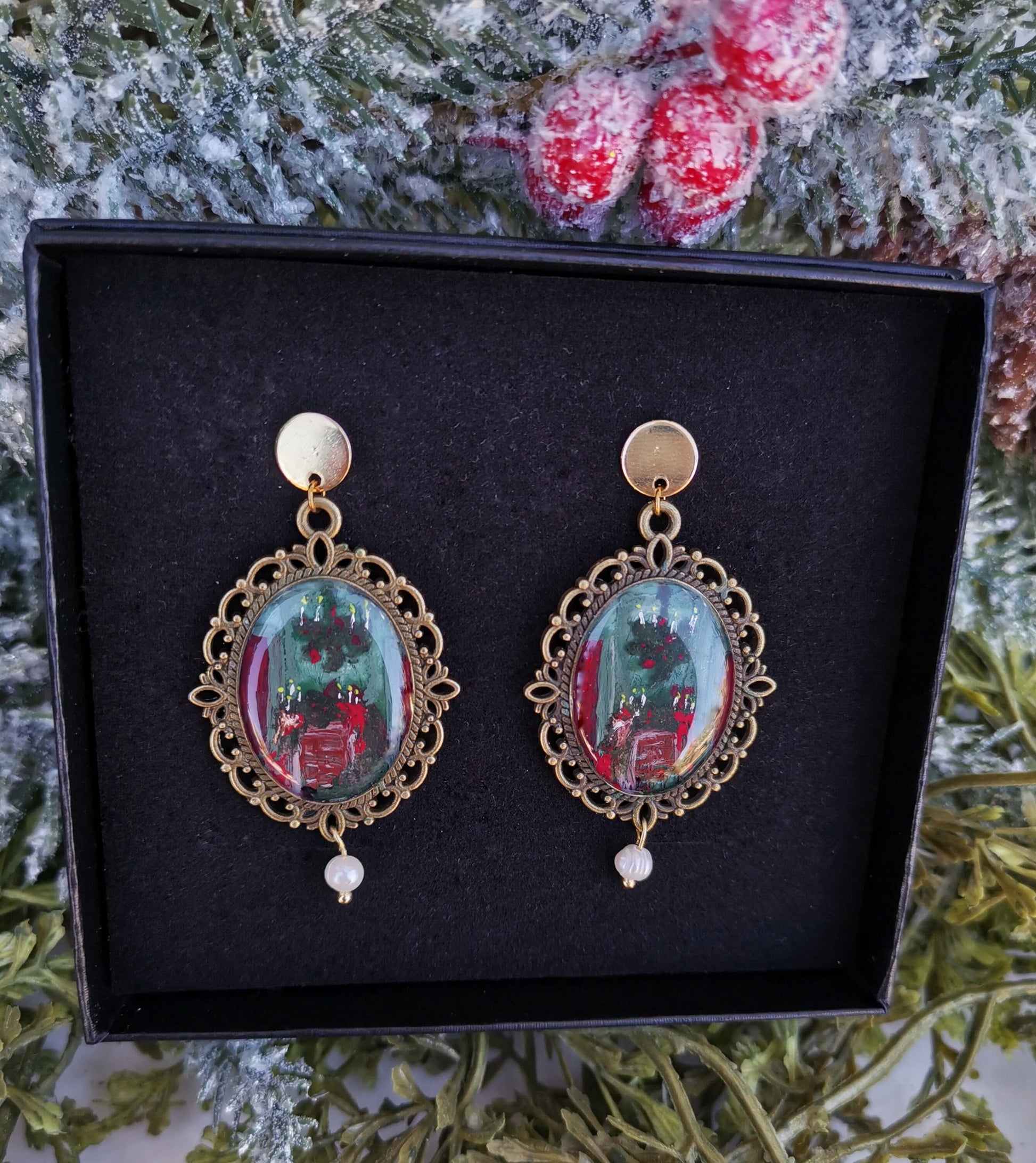 ¡Celebra las fiestas con estilo con nuestros aretes Holiday! Cada par presenta un cuarto bellamente decorado con una chimenea pintada a mano para un toque vintage y una vibra navideña misteriosa. Añade un toque de encanto a tus atuendos de temporada y haz que tus fiestas sean aún más especiales con estos aretes únicos.
