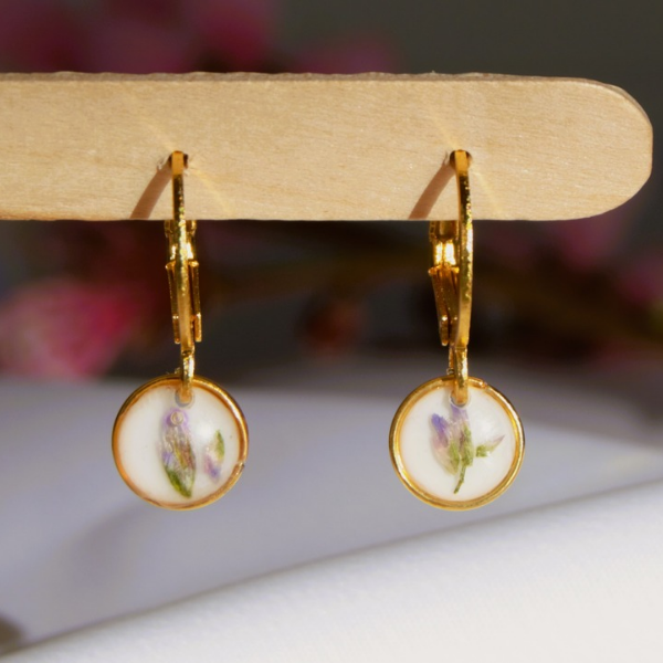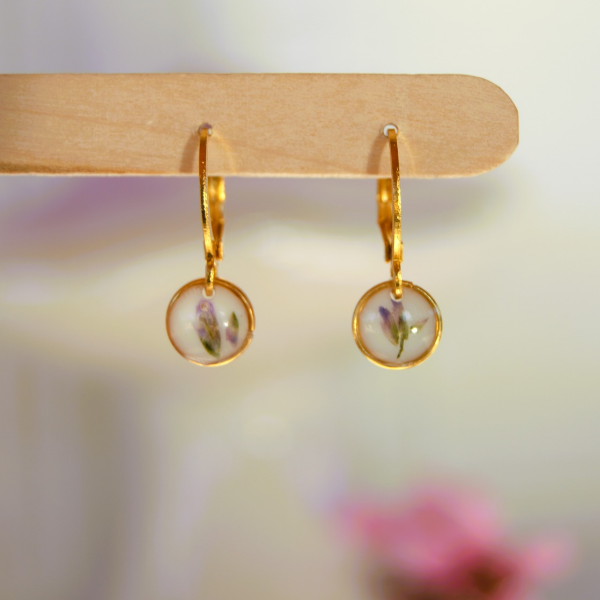 Aretes de acero inoxidable. Resina de UV color blanco con flor natural secada lila.
