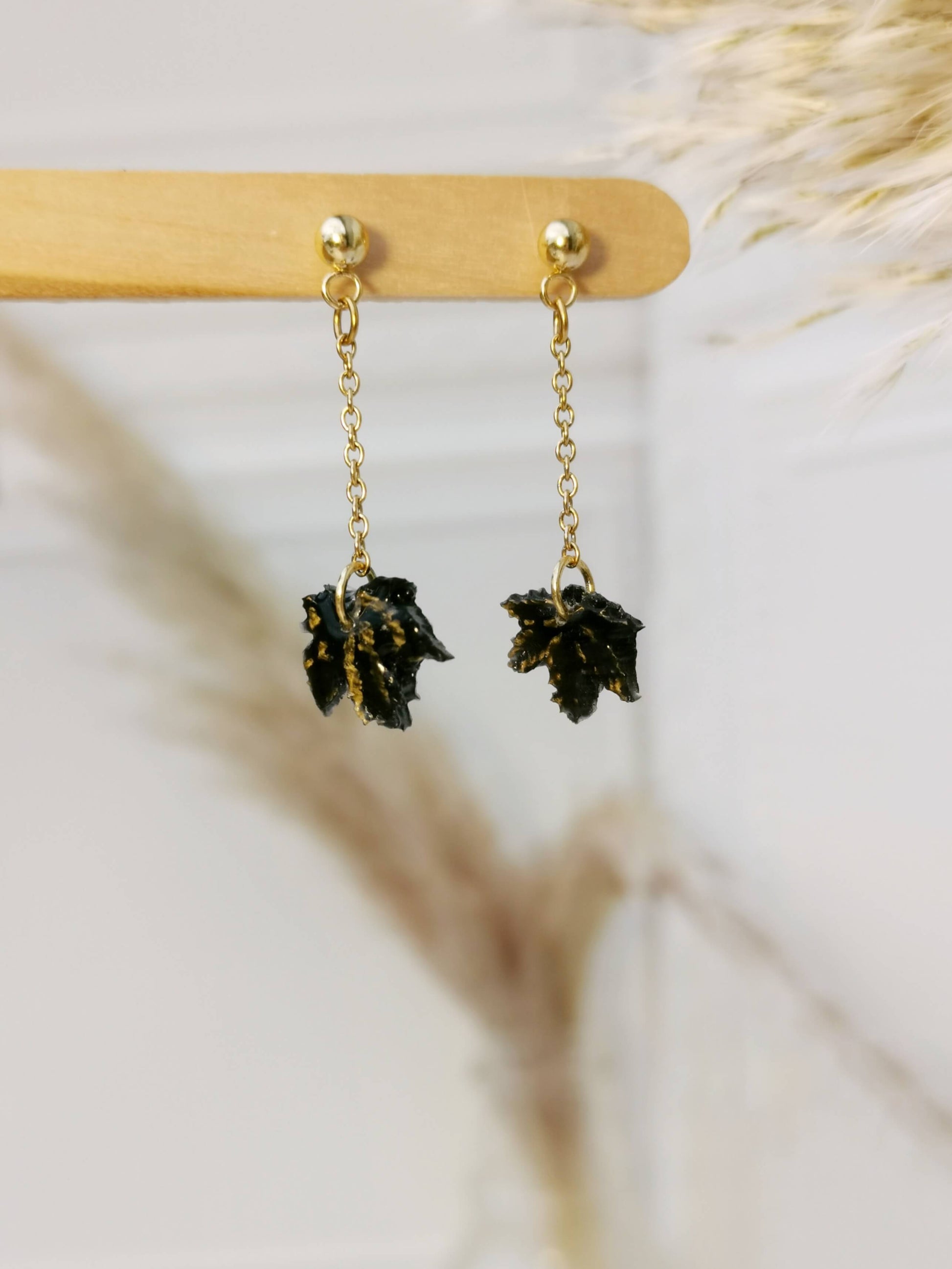 Las hojas están hechas con resina epóxica, color oro es pintado y sellado con una capa de resina uv. Aretes tipo bolita y cadena es de acero inoxidable dorado.