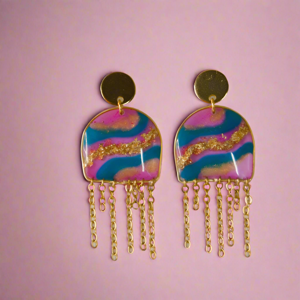 Acero inoxidable, cadena colgante y forma de arco de alambre de cobre calidad AAA. Resina UV diferentes colores y hojas de oro.