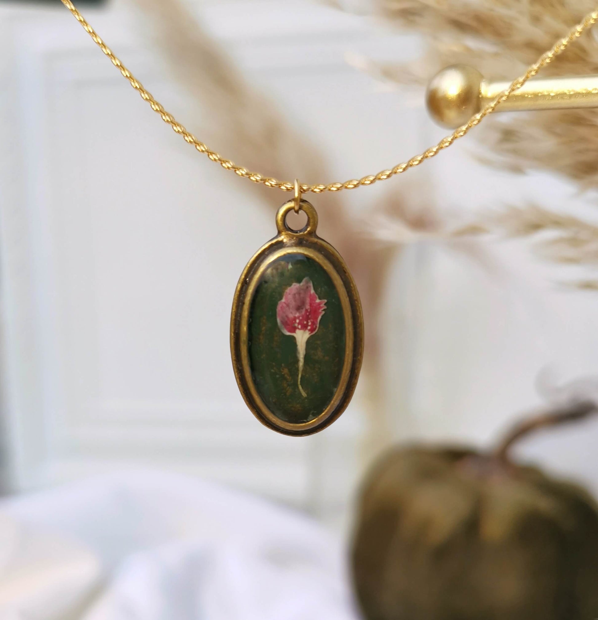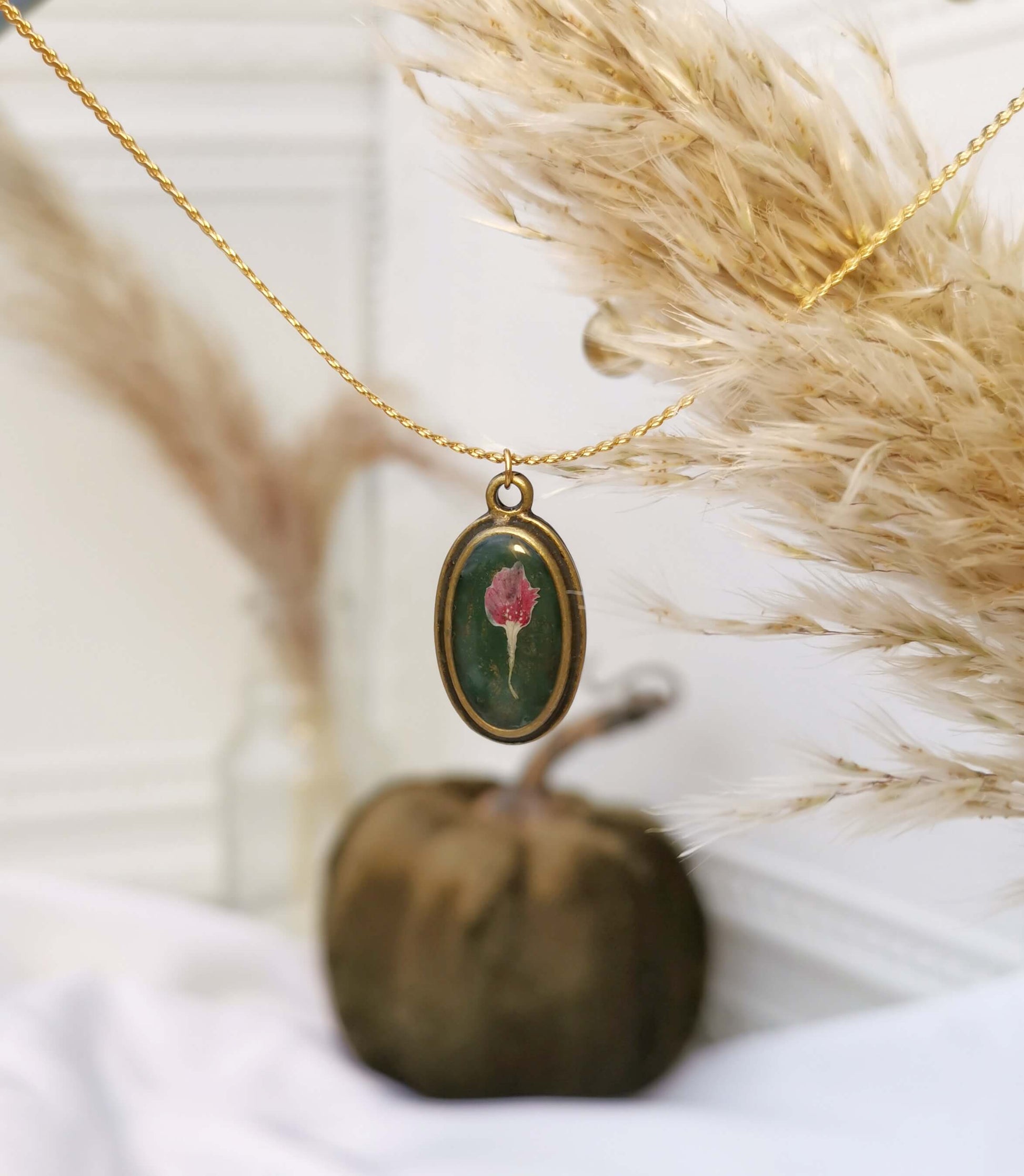 Cadena acero inoxidable dorado. Bisel ovalado bronze antiguo chapado, relleno con resina UV, y flores naturales secadas.