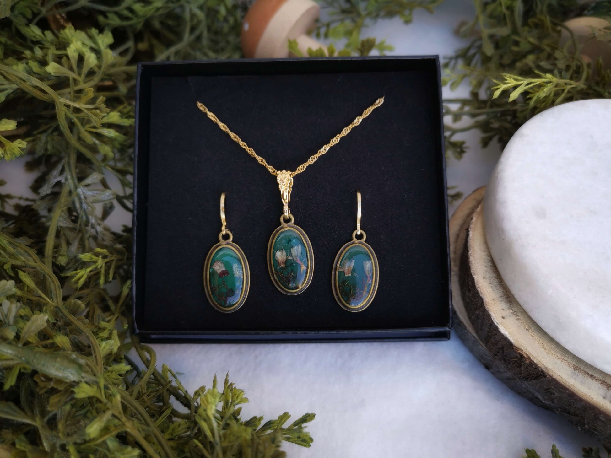Material: Arete Relleno de Oro 18K. Bisel bronze antiguo chapado, relleno con resina UV y flores naturales. Cadena Acero inoxidable dorado. Porta dije relleno de oro.