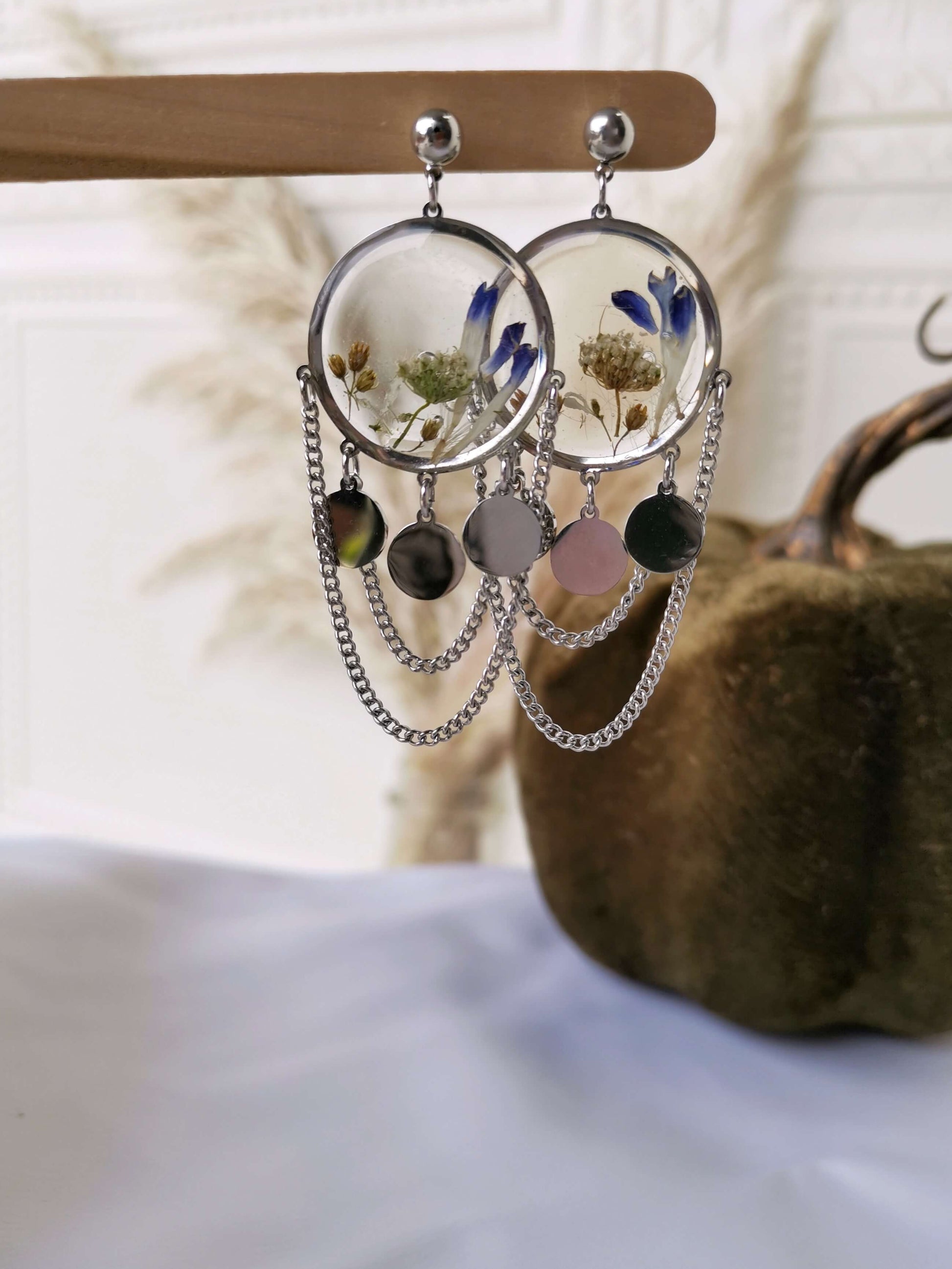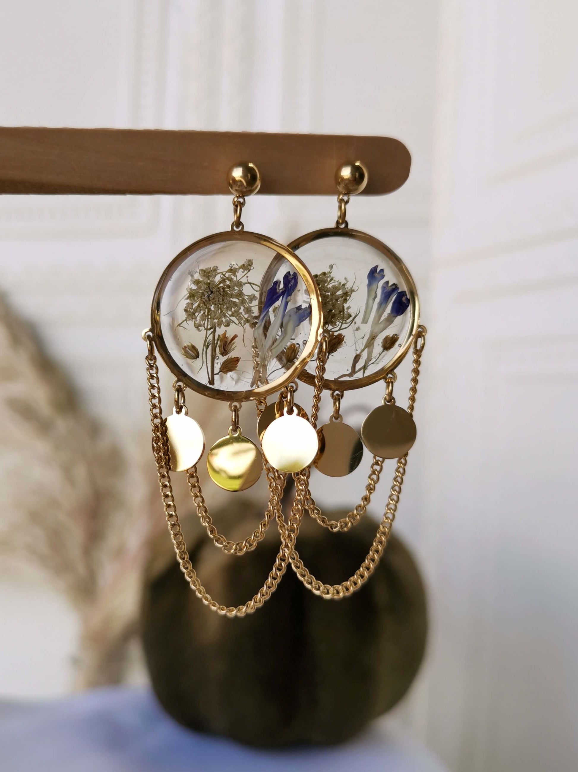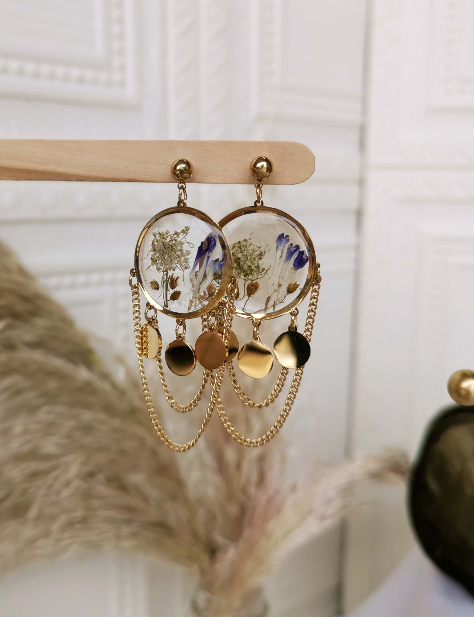Aretes de acero inoxidable, dorados o plateados, rellenos de resina uv transparente con flores naturales.