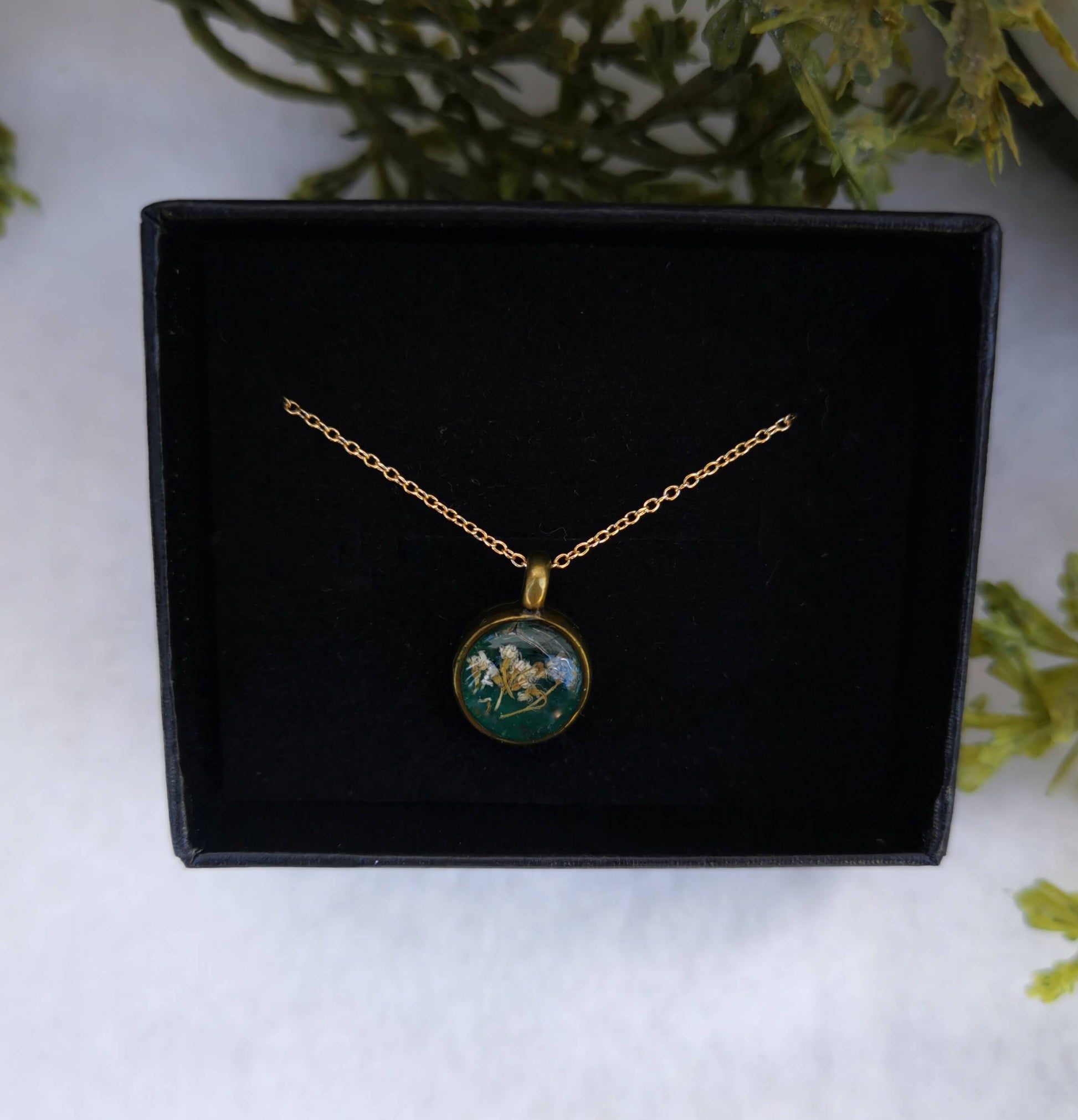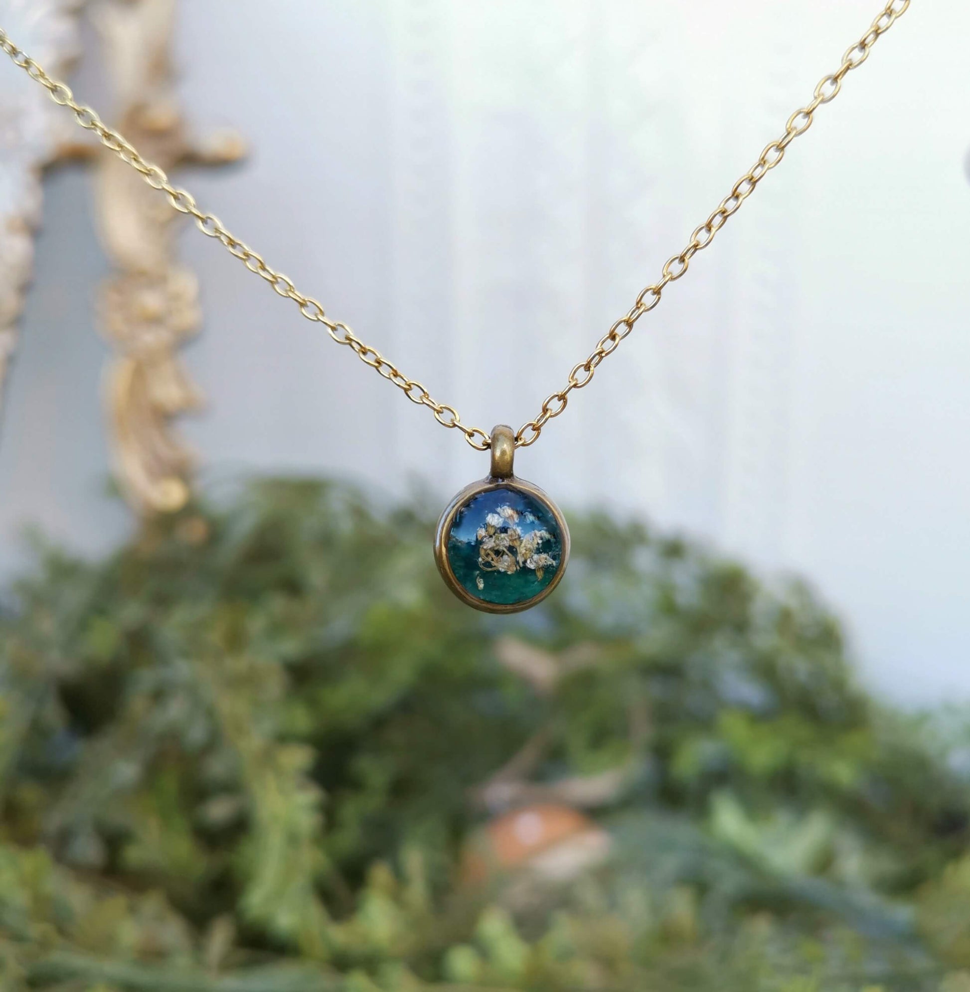 Material: Cadena Relleno de Oro 18 K, resistente. O cadena de acero inoxidable (color dorado). Bisel bronze antiguo chapado. Relleno de Resina UV y flor natural secada.
