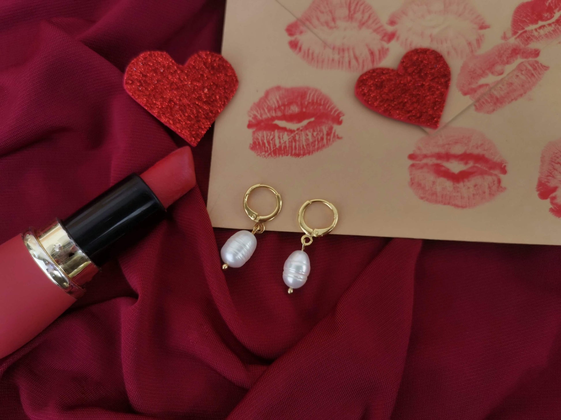 Material: Aretes Huggie relleno de oro 18K. Perla de Rio.