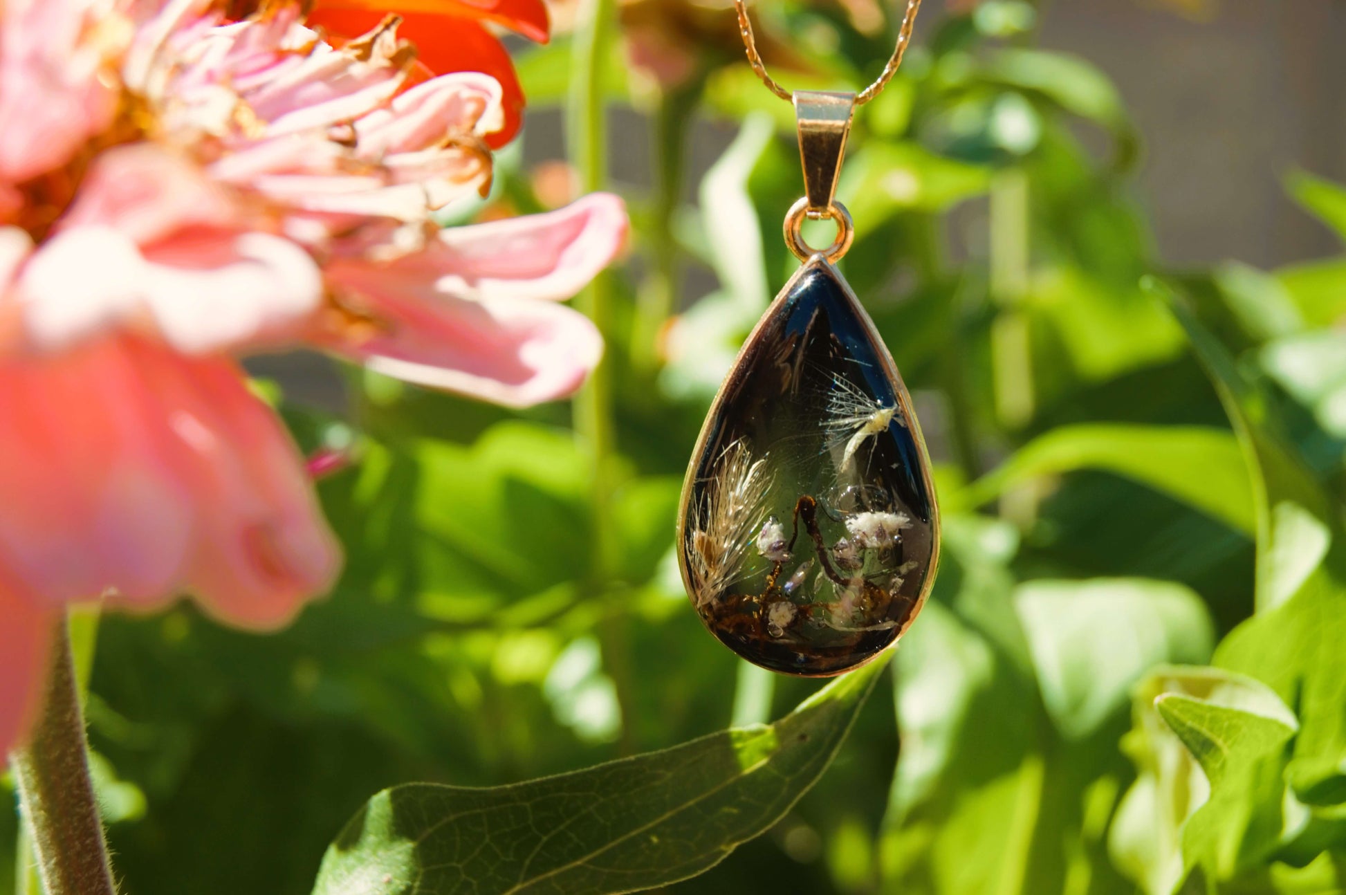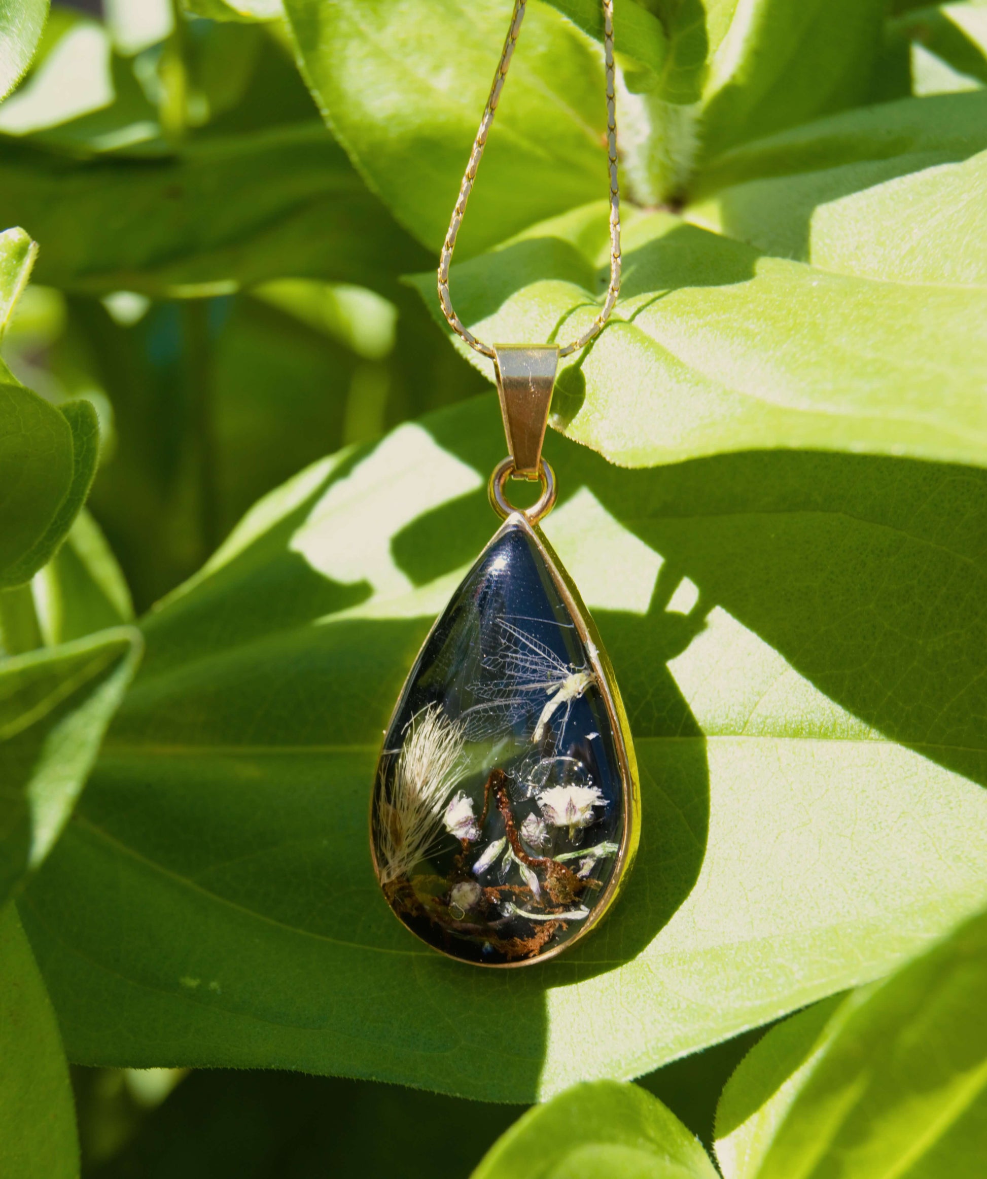 Este collar de Gota Botánica es único en su estilo ya que cuenta con un Chrysopidae encapsulado en su interior. Esto lo hace una pieza de joyería original y fascinante, perfecta para aquellos que buscan añadir un toque de misterio y naturaleza a su atuendo. Hecho con materiales de alta calidad, este collar es una verdadera joya para cualquier ocasión.