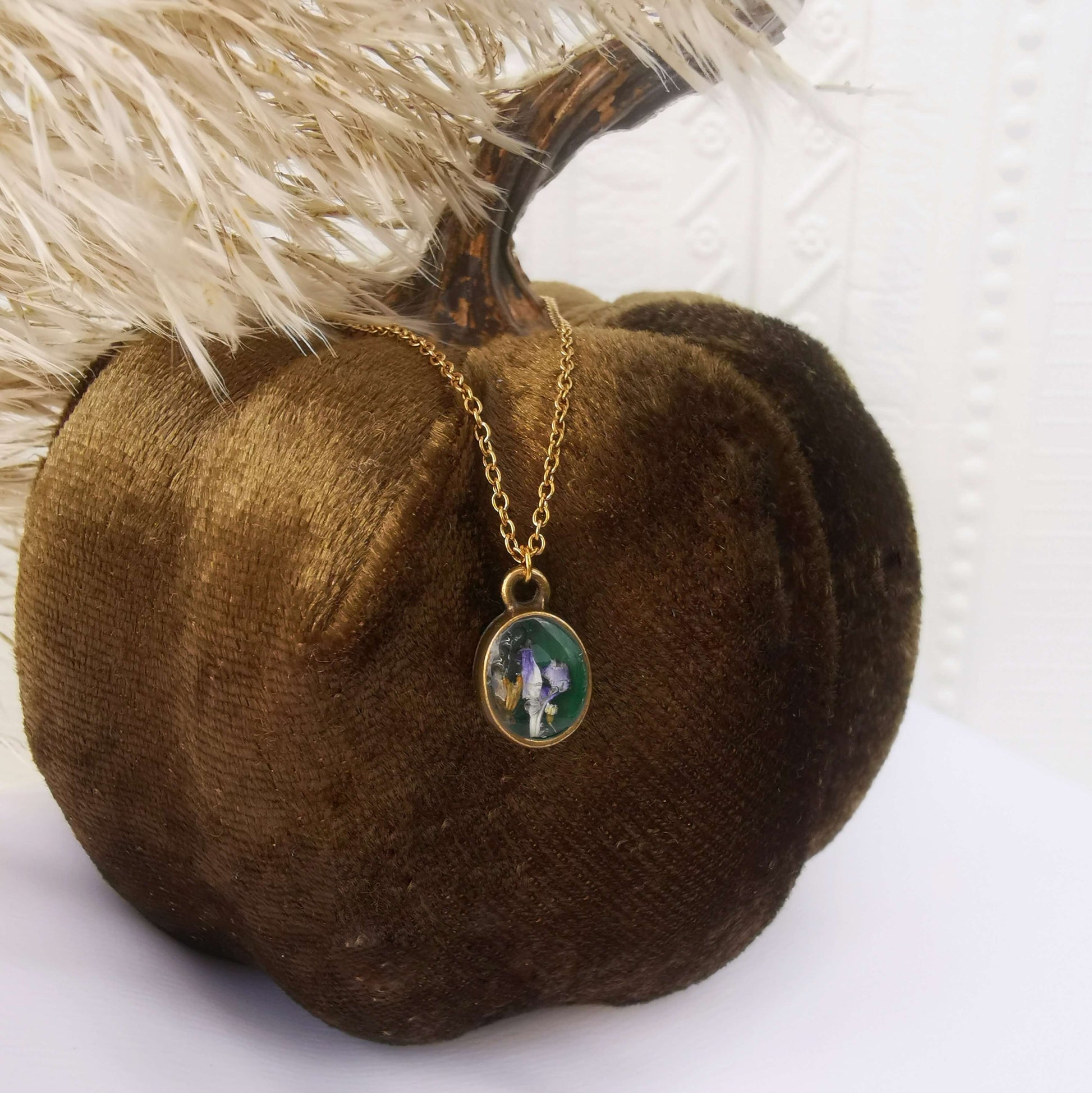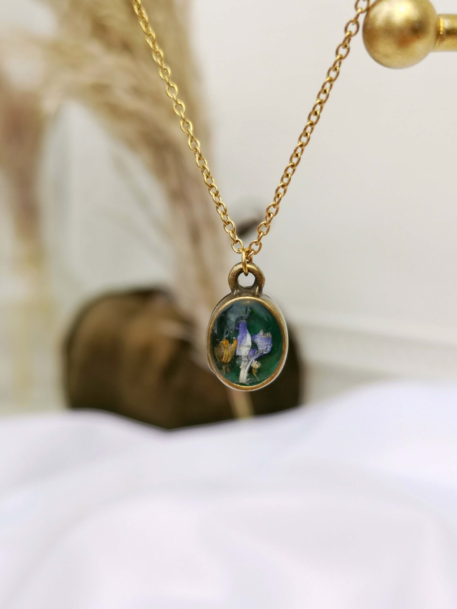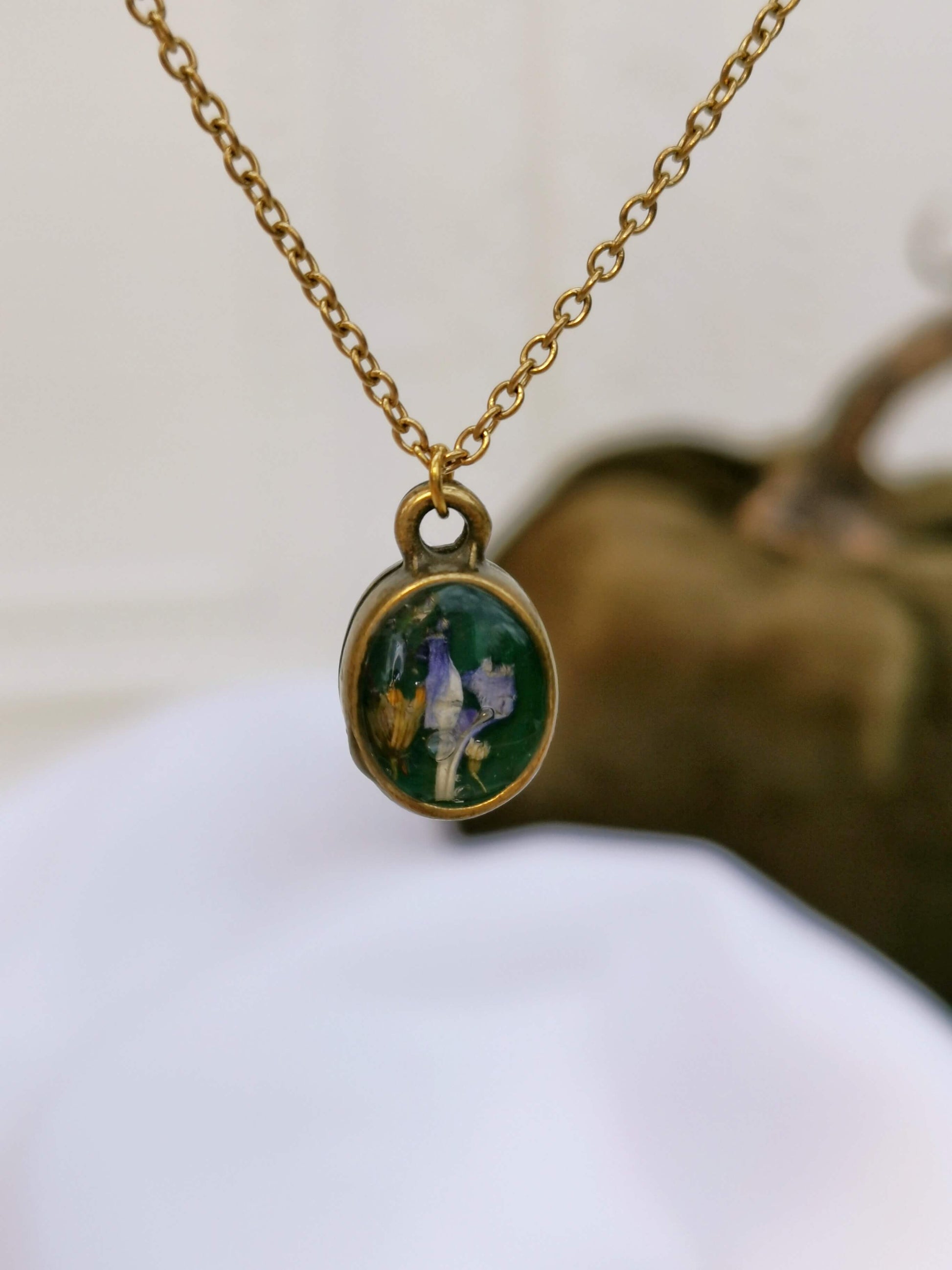 Cadena es de Acero inoxidable dorado. Bisel bronze antiguo chapado. Relleno de resina uv y flores naturales encapsuladas.