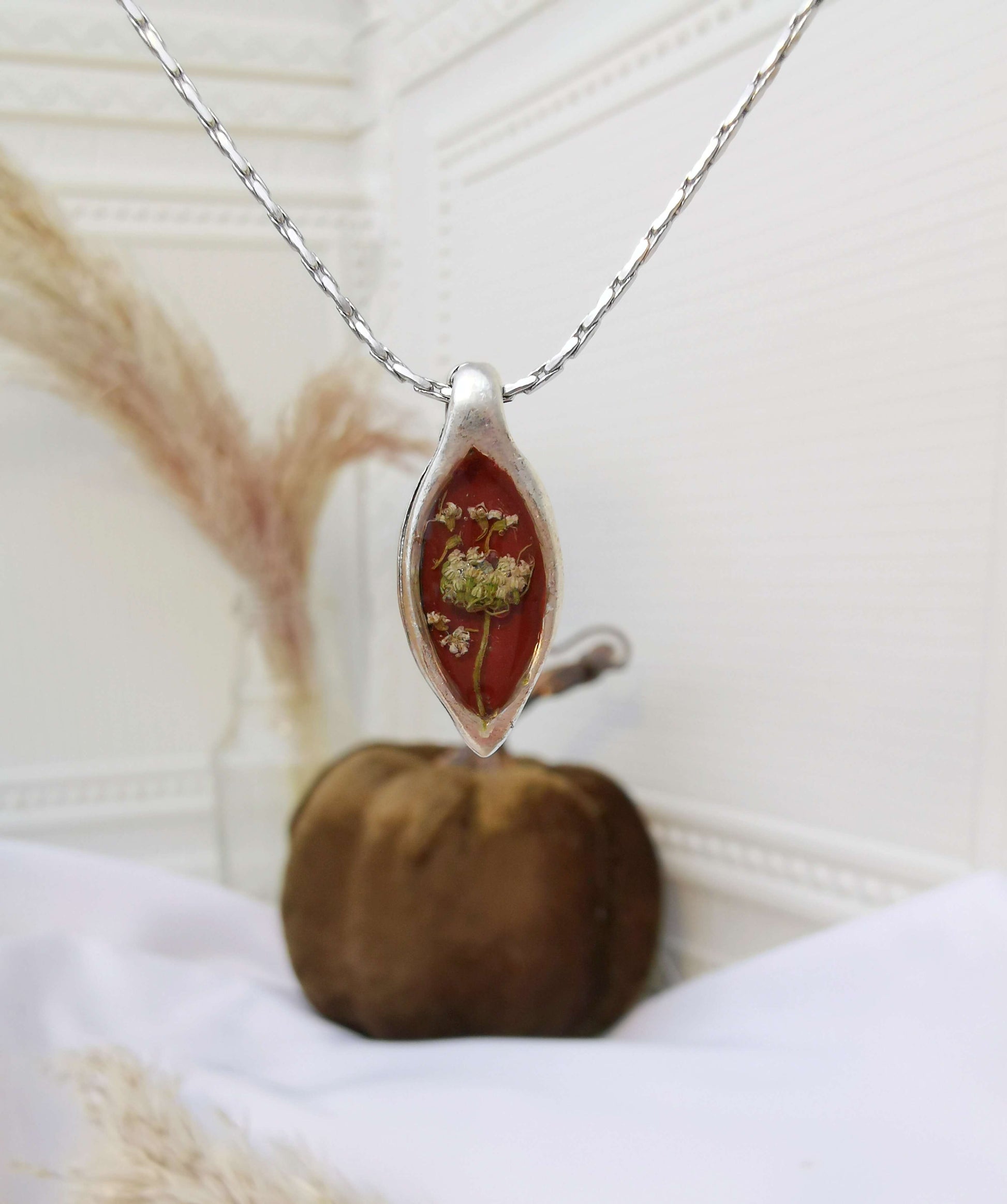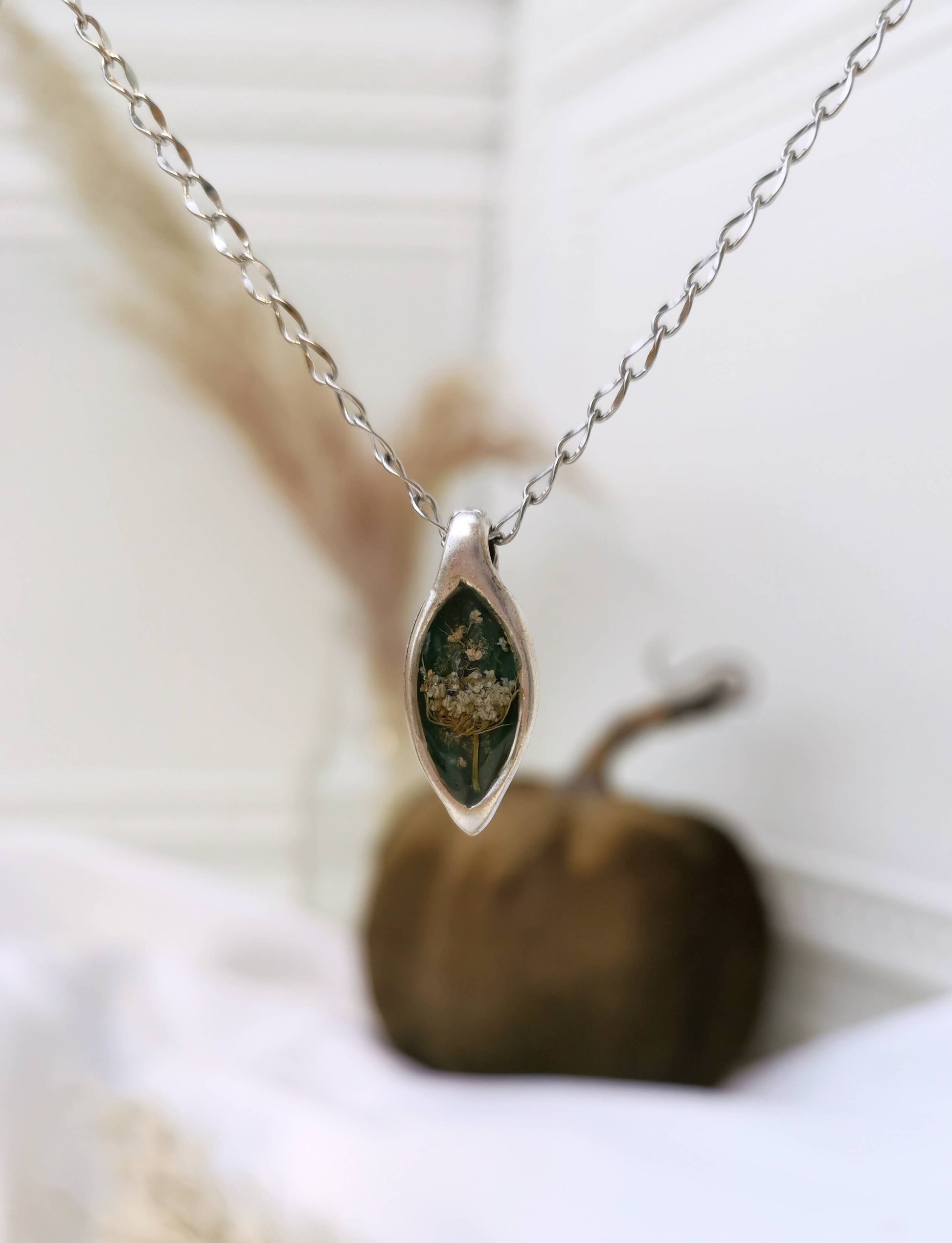 Cadena es de acero inoxidable, Base es de plata antigua: engaste de bisel de zamak, rellena de resina UV y flores naturales.